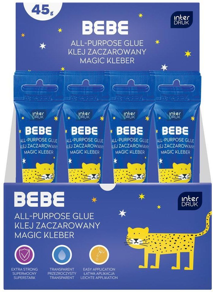 Cechy produktu Idealny do klejenia papieru, kartonu, drewna, filcu, tworzyw sztucznych i in. Sprawdza się przy robieniu makiet, sklejaniu opakowań, klejeniu puzzli czy różnych pracach plastycznych. Trwała i elastyczna tubka nie pęka podczas zginania, a specjalna końcówka umożliwia precyzyjną aplikację. Przezroczysty po wyschnięciu. Kraj produkcji: PL Klej zaczarowany 45g Bebe Kids – Idealny do kreatywnych projektów Klej zaczarowany Bebe Kids to niezastąpiony produkt dla małych artystów i kreatywnych dusz. Dzięki swojej wszechstronności, sprawdzi się w wielu projektach plastycznych, od prostych prac po bardziej skomplikowane makiety. Dla kogo jest ten produkt? Rodzice poszukujący bezpiecznych materiałów do zabawy dla dzieci Nauczyciele i wychowawcy prowadzący zajęcia plastyczne Uczniowie i studenci zajmujący się projektami artystycznymi Osoby zajmujące się rękodziełem i DIY Co zyskasz dzięki temu produktowi? Łatwość w klejeniu różnych materiałów, takich jak papier, karton, drewno czy filc Precyzyjna aplikacja dzięki specjalnej końcówce Trwałość i elastyczność – tubka nie pęka podczas zginania Przezroczystość po wyschnięciu, co zapewnia estetyczny efekt końcowy Kluczowe tematy i obszary Kreatywność i sztuka Prace plastyczne i rękodzieło Bezpieczne materiały dla dzieci Projekty DIY i makiety O Wydawcy Interdruk to renomowane wydawnictwo, które od lat dostarcza wysokiej jakości artykuły papiernicze i kreatywne materiały dla dzieci. Dzięki innowacyjnym rozwiązaniom i dbałości o bezpieczeństwo, produkty Interdruk cieszą się zaufaniem wśród rodziców i nauczycieli. Producent/osoba odpowiedzialna za bezpieczeństwo produktuINTERDRUK S.A.Łucka 1500-842 Warszawainfo@interdruk.com.pl+48 22 486 60 00
