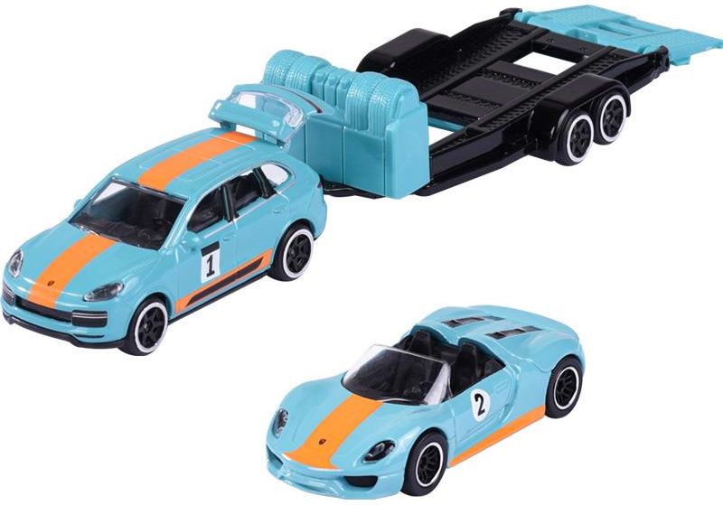 Porsche Cayenne Turbo S + przyczepa i Porsche 918 Spyder z serii Race Trailer. Majorette jest kultową francuską marką popularną na całym świecie wśród fanów samochodów. Przez dekady te niewielkie 7,5 centymetrowe samochodziki zyskały międzynarodową sławę. Dla wielu pokoleń stały się obiektami kolekcjonerskimi lub po prostu przedmiotami do wielogodzinnej zabawy. Od lat Majorette współpracuje z przedstawicielami branży motoryzacyjnej, co pozwoliło udoskonalić i tak bardzo realistycznie odwzorowywać modele pojazdów. Od samochodów osobowych, komercyjnych i budowlanych, aż po samochody wyścigowe oraz zestawy do zabawy - różnorodność sprawia, że każdy znajdzie coś dla siebie. Majorette Race Trailer to zupełnie nowa odsłona kultowych aut. Te zaskakujące zestawy składają się z 3 elemetów: 2 limitowanych aut oraz przyczepy do transportu samochodów. W każdym z zestawów jeden z pojazdów jest przystosowany do ciągnięcia dwuosiowej przyczepy wyposażonej w rozkładane najazdy, dzięki którym drugie auto może wjechać na kołach do środka. Taki zestaw to wyjątkowa atrakcja zarówno dla chłopców kochających zabawę Majorette jak i dla kolekcjonerów marki. Charakterystyka produktu: zestaw 2 aut w standardowych rozmiarach auta posiadają ruchome kółka i otwierane elementy 2-osiowa przyczepa do transportu aut rozkładane najazdy