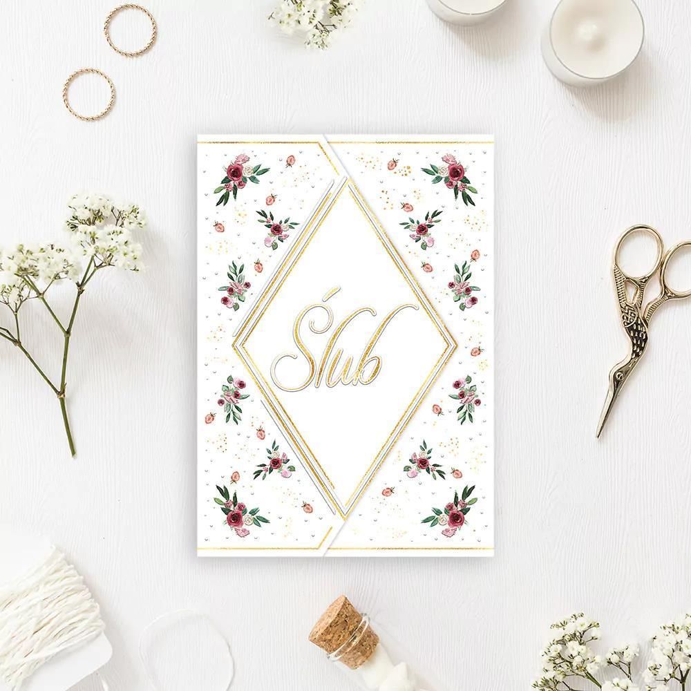 Karnet z kieszonką na pieniądze w formacie A5, składany z trzech. Złocony i tłoczony, teksy życzeń w środku. Wydrukowany na wysokiej jakości papierze. W zestawie koperta. Oprawa: folia Format: 212x157 mm