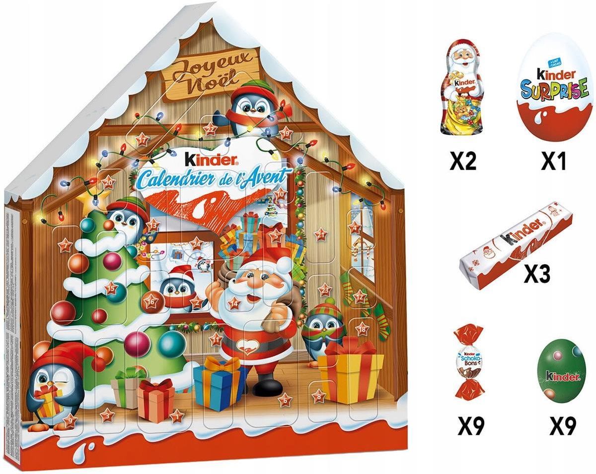 KINDER CZEKOLADKI XXL DUŻY ZESTAW CZEKOLADEK dla Dzieci PREZENT na ŚWIĘTA 4587 KINDER CZEKOLADKI XXL DUŻY ZESTAW CZEKOLADEK dla Dzieci PREZENT na ŚWIĘTA 184g To pełen świątecznej magii kalendarz, który umili każdy dzień grudnia aż do Świąt. Ten uroczy kalendarz, pełen uwielbianych przysmaków Kinder, idealnie sprawdzi się jako słodki element odliczania do Bożego Narodzenia. Kalendarz w formie domku świątecznego, który przyciąga uwagę i doskonale wpasowuje się w bożonarodzeniowy klimat. Świetnie nadaje się na dekorację i świąteczny akcent w domu. W kalendarzu znajdziesz ulubione czekoladki Kinder, w tym Kinder Mini Eggs z nadzieniem orzechowym, Kinder Shoko-Bons z mleczno-czekoladowym wnętrzem, klasyczne batoniki Kinder, figurki Mikołaja i słynne Kinder Jajko Niespodzianka. Niezastąpiony sposób na słodkie odliczanie do Świąt! 24 okienka skrywają słodkie niespodzianki, dzięki którym każdy dzień stanie się wyjątkowy. Zestaw dedykowany wszystkim miłośnikom czekolady Kinder, niezależnie od wieku – sprawdzi się jako prezent na Mikołajki, pod choinkę lub słodki dodatek do świątecznych podarunków. Różne wzory. Wysyłamy losowo. Kalendarz zawiera 2x Kinder Mikołaj 9x Kinder Schoko Bons 1x Kinder Jajko Niespodzianka 3x Kinder batonik 9x Kinder jajko Skład Kinder schokobons: czekolada mleczna 50% (cukier, mleko pełne w proszku, tłuszcz kakaowy, miazga kakaowa, emulgator: lecytyny (soja), wanilina), cukier, mleko odtłuszczone w proszku (12,5%), olej palmowy, orzechy laskowe (5,8%), masło odwodnione, czekolada (cukier, miazga kakaowa, tłuszcz kakaowy, emulgator: lecytyny (soja), wanilina), substancje glazurujące (guma arabska, szelak), syrop glukozowy, emulgator: lecytyny (soja), aromaty. składniki mleka: 28%. składniki kakao: 16,5%.; kinder circus: czekolada mleczna 45% (cukier, mleko pełne w proszku, tłuszcz kakaowy, miazga kakaowa, emulgator: lecytyny (soja), wanilina), cukier, mleko odtłuszczone w proszku (14,5%), olej palmowy, orzechy laskowe (6,5%), masło odwodnione, emulgator: lecytyny (soja),; kinder figure: czekolada mleczna 45% (cukier, mleko pełne w proszku, tłuszcz kakaowy, miazga kakaowa, emulgator: lecytyny (soja), wanilina), mleko odtłuszczone w proszku (17,5%), cukier, tłuszcze roślinne (palmowy, shea), masło odwodnione, emulgator: lecytyny (soja), wanilina. składniki mleka: 32%. składniki kakao: 14,5%. ; kinder chocolate:czekolada mleczna 40% (cukier, mleko pełne w proszku, tłuszcz kakaowy, miazga kakaowa, emulgator: lecytyny (soja), wanilina), cukier, mleko odtłuszczone w proszku (18%), olej palmowy, masło odwodnione, emulgator: lecytyny (soja), wanilina. składniki mleka