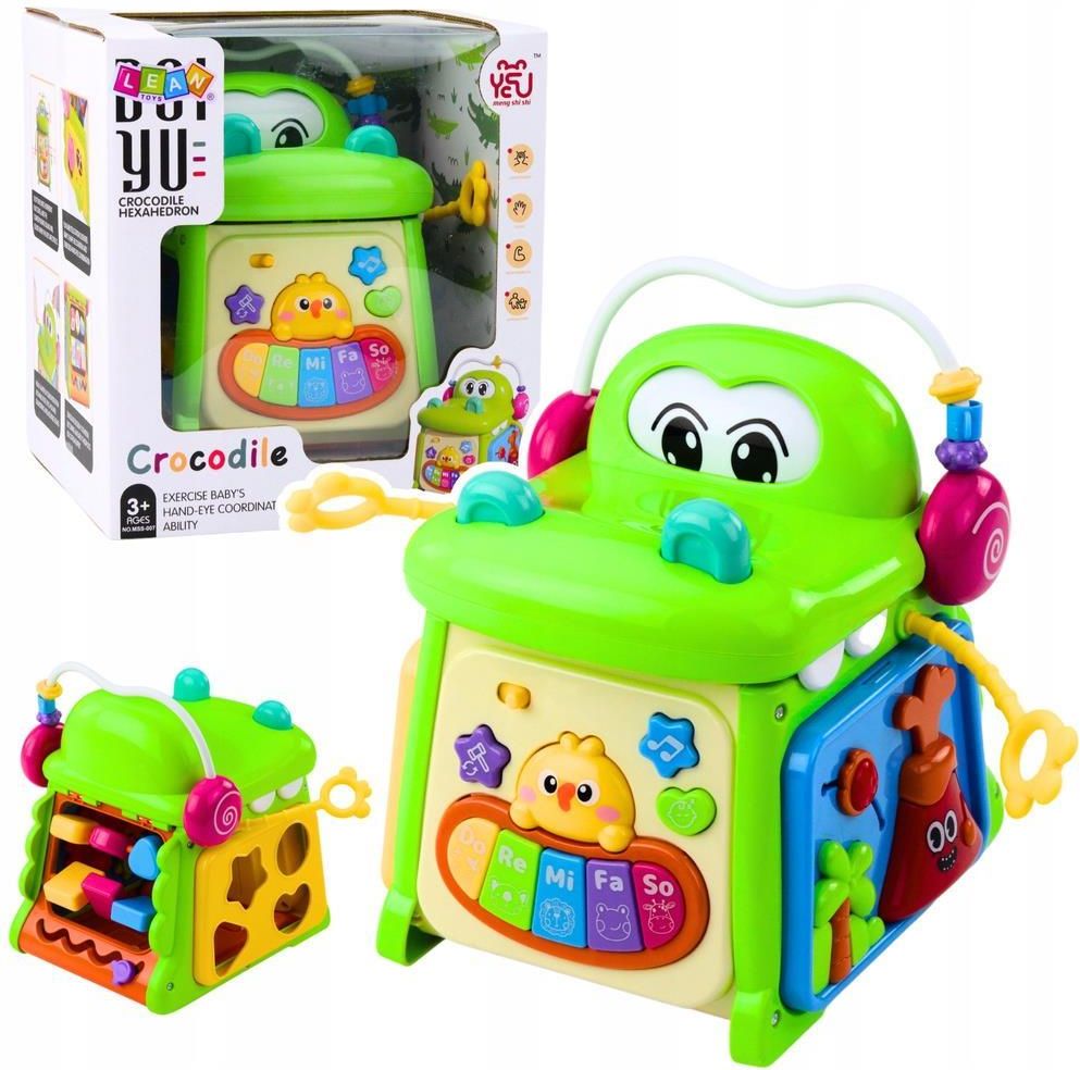 KOSTKA EDUKACYJNA KROKODYL Wielofunkcyjna interaktywna kostka edukacyjna to rozbudowana zabawka sensoryczna, która dostarcza dziecku wiele bodźców wspierających jego rozwój na różnych płaszczyznach. Kostka została zaprojektowana z myślą o stymulacji zmysłów, motoryki oraz koordynacji wzrokowo-ruchowej poprzez zastosowanie różnorodnych tekstur, kształtów i dźwięków. Zabawka zawiera m.in. pianinko z kolorowymi klawiszami „Do, Re, Mi, Fa, So", ruchome elementy do manipulowania, zegar z ruchomymi wskazówkami oraz sortery z klockami o różnych kształtach. Każdy bok kostki oferuje inne aktywności, co sprawia, że zabawka długo utrzymuje zainteresowanie dziecka. Wszystkie elementy są odpowiednio duże i mają zaokrąglone krawędzie, co zapewnia bezpieczeństwo podczas zabawy. Wbudowane miejsce do przechowywania klocków zapobiega ich zgubieniu, a wyciągany panel oraz liczne ruchome detale pozwalają dziecku rozwijać sprawność manualną oraz uczyć się przez doświadczenie. Zabawka idealnie sprawdzi się zarówno do samodzielnej, jak i wspólnej zabawy. SPECYFIKACJA Rodzaj zabawki: interaktywna kostka edukacyjna Funkcje rozwojowe: stymulacja sensoryczna, rozwój motoryki małej, nauka precyzji i koordynacji Bezpieczeństwo: zaokrąglone krawędzie, brak drobnych elementów do połknięcia Wymiary: 15 cm x 17 cm x 20 cm Wymiary opakowania: 21 cm x 21 cm x 24 cm Materiał: wysokiej jakości plastik ABS Wbudowane akcesoria: Grzechotki i obrotowe kółeczka, Lusterko, elementy do obracania i przesuwania ZAWARTOŚĆ ZESTAWU Interaktywna kostka edukacyjna z ruchomymi elementami i akcesoriami oryginalne opakowanie Informacje o produkcie Certyfikat CE, EN71 Ostrzeżenie! Nieodpowiednie dla dzieci w wieku poniżej 3 lat Wiek +3 Długość towaru w centymetrach 21 Wysokość towaru w centymetrach 24 Szerokość towaru w centymetrach 21 Waga gabarytowa w gramach 1764