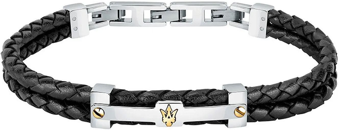 Szczegóły biżuteriiMateriały: stal, skóra z recyklinguDługość: 22 cmZapięcie: klipsPodsumowanie biżuteriiBransoletka Maserati (numer artykułu: JM422AVE11) z kolekcji Maserati RECYCLED LEATHER to elegancka męska bransoletka wykonana ze stali i skóry pochodzącej z recyklingu. Dzięki długości 22 cm i praktycznemu zapięciu na zatrzask jest to nowoczesny dodatek, który łączy w sobie sportowy charakter i elegancję.Komfort noszeniaBransoletka (numer artykułu: JM422AVE11) jest wygodna w noszeniu dzięki optymalnej długości 22 cm. Praktyczne zapięcie na zatrzask ułatwia zakładanie i zdejmowanie bez uszczerbku dla bezpieczeństwa. Skóra z recyklingu zapewnia również miękkość i wygodę.Szczegóły kolorystyczneCzarny ze srebrnymi akcentamiRésuméBransoletka Maserati (numer artykułu: JM422AVE11) to nie tylko stylowy dodatek, ale także wybór świadomy ekologicznie. Dzięki nowoczesnemu wzornictwu i wykorzystaniu skóry z recyklingu jest to wyjątkowa biżuteria, która podkreśla indywidualny styl jej użytkownika. modna bransoletka dla mężczyzn, wykonana ze skóry i polerowanej stali nierdzewnej, dwa sznurki wykonane z czarnej skóry z recyklingu, zamontowana płytka ze stali nierdzewnej o długości 33 mm, wypukłe logo Maserati i śruby, pozłacane różowym złotem, długość 22 mm, można skrócić za pomocą dwóch odłączanych ogniw końcowych, szerokość 9 mm, składane zapięcie z wygrawerowanym napisem marki Biżuteria Maserati: idealne połączenie elegancji i sportowego charakteru: mieszanka włoskiego stylu i pasji do jazdy, która nie zna rywali.