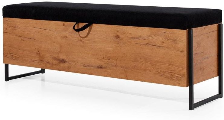 Pufa z pojemnikiem LFPU z zestawu Loft Zestaw Loft powstał z połączenie płyty meblowej, imitującej drewno dębowe Lancelot z czarnym metalem. Metalowe elementy: ramka na lustrze, nogi łóżka, stolików nocnych, toaletki i komody oraz obrzeże wezgłowia pięknie komponują się z płytą imitującą drewno. …