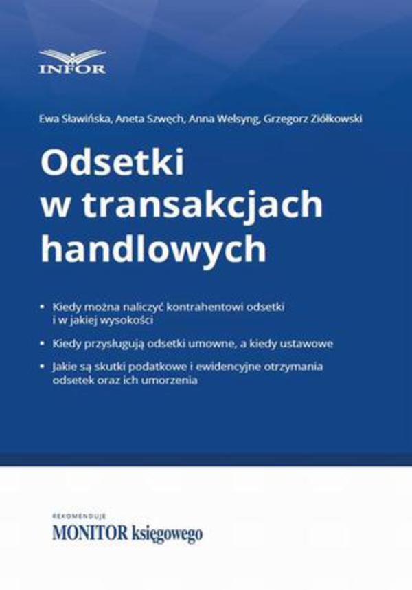 Publikacja zawiera pełną wiedzę na temat odsetek w transakcjach pomiędzy przedsiębiorcami. Znajdują się w niej wszystkie informacje, które każdy przedsiębiorca powinien wiedzieć o tym: Kiedy i jakie odsetki mogą być naliczane W jakiej wysokości odsetki mogą być naliczane Jak obliczać odsetki Jak rozliczać odsetki podatkowo i je ewidencjonować Odsetki to wynagrodzenie za korzystanie z naszych pieniędzy lub kara za opóźnienie w wykonaniu zobowiązań. W rozliczeniach między przedsiębiorcami pełnią one istotną rolę ze względu na swój wymiar finansowy. Mogą być umowne, ustawowe, od kapitału i za opóźnienie. Mogą też być maksymalne. Inne procedury naliczania odsetek obowiązują w relacjach z konsumentami, inne w rozliczeniach z przedsiębiorcami i z jednostkami sektora finansów publicznych. Problemów jest wiele – rozwiązania znajdziesz w tej publikacji.