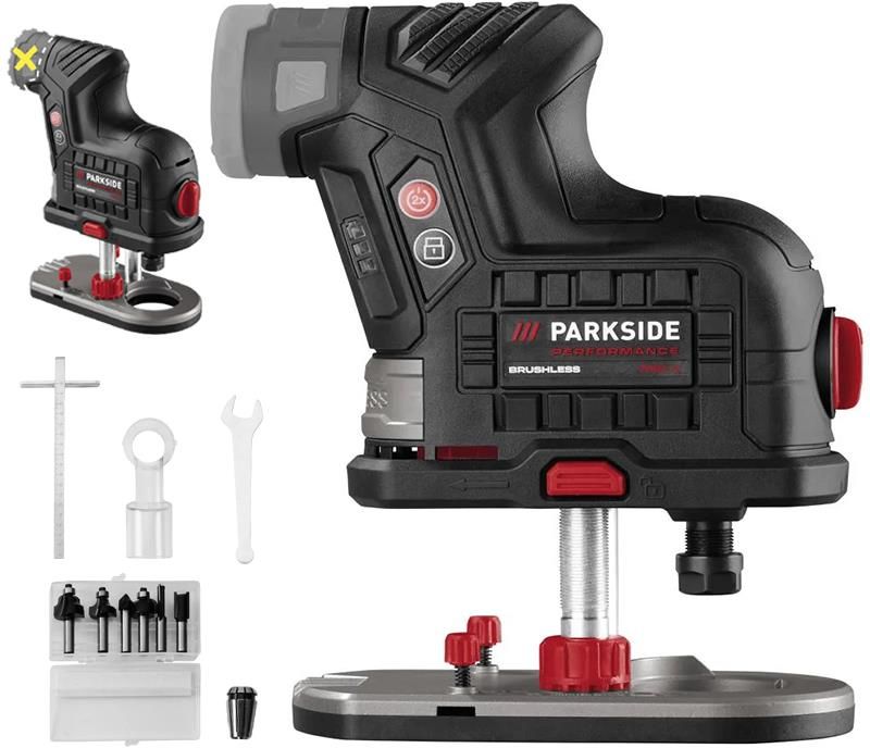 Frezarka krawędziowa Parkside PPAKF 12 A1 6-częściowy zestaw frezów do drewna (1 frez profilowy, 1 frez do zaokrąglania, 1 frez do rowków V, 2 frezy do rowków, 1 frez do rowków ćwierćwałkowych) 1 prowadnica równoległa 1 tuleja zaciskowa 1 klucz oczkowy 1 adapter do zewnętrznego odsysania pyłu …