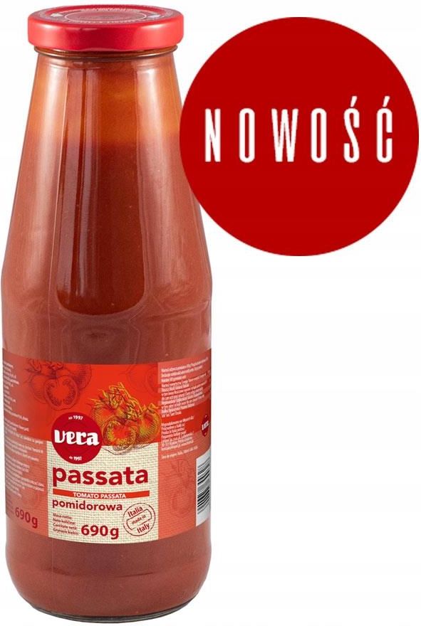 Vera Passata pomidorowa to prawdziwy skarb włoskiej kuchni, który przyciąga uwagę swoim intensywnym smakiem i doskonałą jakością. Wytwarzana ze starannie wyselekcjonowanych, świeżych pomidorów, zbieranych w pełni lata, passata ta gwarantuje wyjątkowe doznania smakowe. Dzięki procesowi produkcji, który zachowuje naturalne walory pomidorów, Vera Passata staje się niezastąpioną bazą w wielu potrawach. Wykorzystaj Vera Passata jako doskonałą bazę do sosów do makaronów, pizz, a także jako składnik aromatycznych zup pomidorowych czy orzeźwiających chłodników. To idealny wybór dla każdego, kto pragnie wzbogacić swoje dania o intensywny smak i naturalne składniki. Vera Passata łączy w sobie tradycję i nowoczesność, co czyni ją produktem klasy premium. Passata dostępna jest w eleganckiej butelce o pojemności 690 g, co sprawia, że jest wygodna w użyciu i przechowywaniu. Skład: pomidory (99,6%), sól. Wartość odżywcza (na 100 g): wartość energetyczna: 131 kJ/31 kcal, tłuszcz: <0,5 g, w tym kwasy nasycone: <0,1 g, węglowodany: 6 g, w tym cukry: 4 g, białko: 1,1 g, sól: 0,4 g. Sposób przechowywania: Przechowywać w suchym i chłodnym miejscu. Po otwarciu zaleca się przechowywanie w lodówce i spożycie w ciągu 3 dni, aby cieszyć się najlepszymi walorami smakowymi. Kraj pochodzenia: Włochy. Producent: Limpol Sp.z.o.o., ul. Ludwinowska 7, 30-331 Kraków. Vera Passata to wybór, który doceni każdy miłośnik włoskiej kuchni oraz osoby poszukujące wysokiej jakości, naturalnych składników w swojej codziennej diecie.