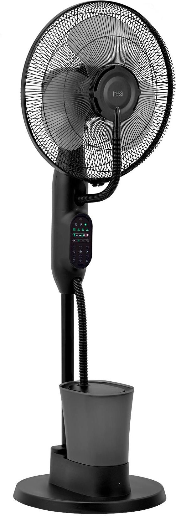 Wentylator stojący Teesa z funkcją mgiełki Uciążliwe upały potrafią skutecznie zepsuć komfort w domu i biurze. Wentylator stojący Teesa z funkcją mgiełki to idealne rozwiązanie na gorące dni. Dzięki połączeniu wydajnej cyrkulacji powietrza z nawilżającą mgiełką, skutecznie obniża temperaturę otoczenia i poprawia samopoczucie. Dostosowany do Ciebie Dopasuj działanie wentylatora Teesa do swoich potrzeb. Do wyboru masz 3 poziomy prędkości nawiewu oraz 3 tryby pracy: normalny – dla intensywnego chłodzenia, naturalny – imitujący podmuchy wiatru i nocny – cichy tryb idealny do snu. Poczuj komfort przez cały dzień i noc, bez zbędnego hałasu. Funkcja mgiełki Chłodzenie z dodatkowym efektem odświeżenia? Tak! Wentylator Teesa posiada funkcję mgiełki wodnej, która delikatnie nawilża powietrze, przynosząc ulgę w najbardziej upalne dni. Trzy poziomy intensywności mgiełki oraz 2,8-litrowy zbiornik zapewniają aż do 8 godzin działania bez konieczności uzupełniania wody. Timer Wentylator Teesa został wyposażony w praktyczny timer, który umożliwia ustawienie czasu pracy od 0,5 do 7,5 godziny. To idealne rozwiązanie na noc lub podczas nieobecności – urządzenie automatycznie się wyłączy, zapewniając komfort bez zbędnego zużycia energii. Sterowanie czasem jest intuicyjne dzięki czytelnemu wyświetlaczowi LCD. Automatyczna oscylacja Zadbaj o równomierne rozprowadzanie chłodnego powietrza w całym pomieszczeniu. Wentylator Teesa oferuje automatyczną oscylację w zakresie 70°, a także regulację kąta nachylenia głowicy. Dzięki temu z łatwością skierujesz powiew tam, gdzie jest najbardziej potrzebny – niezależnie od ustawienia urządzenia. ---------- Funkcje ---------- 3 poziomy prędkości 3 tryby pracy: normalny, naturalny, nocny 3 ustawienia objętości mgiełki Funkcja timera: 0,5 – 7,5 h Automatyczna oscylacja: 70° Regulacja kąta nachylenia Metalowa osłona śmigła Odłączany zbiornik na wodę dla łatwego czyszczenia i uzupełniania Wskaźnik niskiego poziomu wody 5 kółek transportowych ---------- Dane techniczne ---------- Zużycie wody: <200 ml/h Pojemność zbiornika na wodę: 2,8 l Czas działania na pełnym zbiorniku: do 8 godzin Średnica grilla: 43 cm Średnica śmigła: 36 cm Poziom hałasu: 57 dB Zabezpieczenia: przed przegrzaniem, przeciążeniem Moc: 75 W Zasilanie pilota: 2 x bateria AAA (brak w zestawie) Zasilanie: 220 - 240 V; 50 Hz Waga: 7 kg Wymiary: 430 x 380 x 1250 mm Długość przewodu: 1,68 m W zestawie: pilot zdalnego sterowania Jednostka miary: szt.