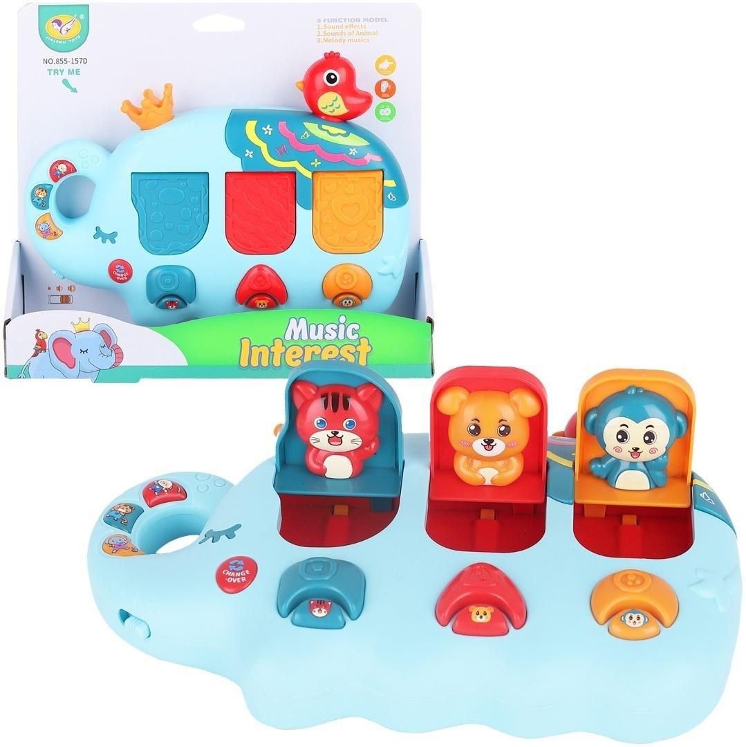 Interaktywna Zabawka Muzyczna "Music Interest" - Słonik z Wyskakującymi Zwierzątkami! Rozbudź ciekawość i rozwijaj zdolności poznawcze swojego maluszka z naszą uroczą interaktywną zabawką muzyczną "Music Interest"! Ten słodki słonik to centrum zabawy, które zachęca do odkrywania dźwięków, kształtów i kolorów, zapewniając godziny angażującej rozrywki. Cechy produktu: Interaktywne elementy: Zabawka posiada trzy kolorowe przyciski/dźwignie w kształcie grzybków, których naciśnięcie lub przesunięcie sprawia, że z odpowiednich "skrytek" wyskakują urocze figurki zwierzątek (kotek, szczeniaczek, małpka). Funkcje muzyczne i edukacyjne: o 3 tryby zabawy ("3 Function Model"): Zabawka oferuje różne tryby, które aktywują dźwięki, melodie i interakcje. o Dźwięki zwierząt ("Sounds of Animal"): Po naciśnięciu zwierzątka mogą wydawać swoje charakterystyczne dźwięki, co wspiera rozpoznawanie zwierząt. o Melodie i piosenki ("Music/Songs"): Słonik odtwarza wesołe melodie i piosenki, które bawią i rozwijają słuch muzyczny. Wesoły design: Zabawka w kształcie uśmiechniętego, niebieskiego słonika z królewską koroną i małym ptaszkiem na głowie, jest estetyczna i przyjazna dla dzieci. Kolorowe przyciski i figurki zwierzątek dodatkowo stymulują wzrok. Rozwój kluczowych umiejętności: o Motoryka mała: Naciskanie, przesuwanie i manipulowanie elementami rozwija zręczność palców i koordynację ręka-oko. o Przyczyna i skutek: Dziecko uczy się zależności między swoim działaniem a reakcją zabawki. o Rozwój sensoryczny: Dźwięki, kolory i różnorodne tekstury stymulują zmysły wzroku, słuchu i dotyku. o Kreatywność i wyobraźnia: Odgrywanie scenek ze zwierzątkami rozwija wyobraźnię. Przycisk "TRY ME!": Możliwość przetestowania funkcji zabawki bezpośrednio w opakowaniu. Bezpieczeństwo: Produkt wykonany z bezpiecznych, trwałych materiałów, przeznaczony dla najmłodszych. Zasilanie: Wymaga baterii (brak w zestawie). Wielkość opakowania: 24x21x6 cm Interaktywna zabawka "Music Interest" to doskonały wybór dla każdego maluszka, który zaczyna odkrywać świat dźwięków i interakcji. Gwarantuje wiele uśmiechu, radości i wspiera wszechstronny rozwój! EAN: 5901353685331