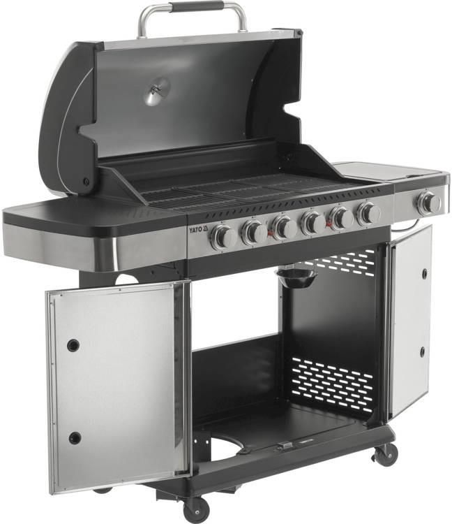 Yato 6+1 Yg20004 Grill gazowy 6+1 o nowoczesnym wyglądzie wykonany ze stali nierdzewnej, wyposażony w żeliwny ruszt. Półki boczne oraz pojemna, zamykana szafka ułatwiają przechowywanie przypraw i niezbędnych akcesoriów. Palnik boczny o mocy 2,2 kW umożliwia gotowanie i podgrzewanie potraw w garnku …