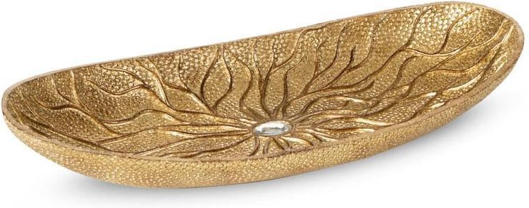 Patera dekoracyjna KIARA 38x18 Eurofirany złota ze żłobieniami i kryształem Eurofirany Patera dekoracyjna to elegancki i stylowy dodatek, który doskonale nadaje się do aranżacji wnętrz. Dzięki swojemu designowi i kolorystyce pasuje do różnorodnych stylów wystroju, dodając pomieszczeniu wyjątkowego uroku i charakteru. Wykonana z wysokiej jakości materiałów, patera jest trwała i solidna, co pozwala na długotrwałe użytkowanie. Doskonale sprawdzi się jako pojemnik na owoce, słodycze czy ciasto. Może też spełniać tylko funkcję ozdobną, która znakomicie uzupełni i podkreśli twój indywidualny styl. To niezwykle uniwersalny element wystroju, który może być wykorzystywany w różnych pomieszczeniach, dodając im elegancji i stylu. Kolor: złoty Skład: 50% żywica poliestrowa, 50% kamionka Rozmiar: 38x18 cm Kolor: złoty Skład: 50% żywica poliestrowa, 50% kamionka