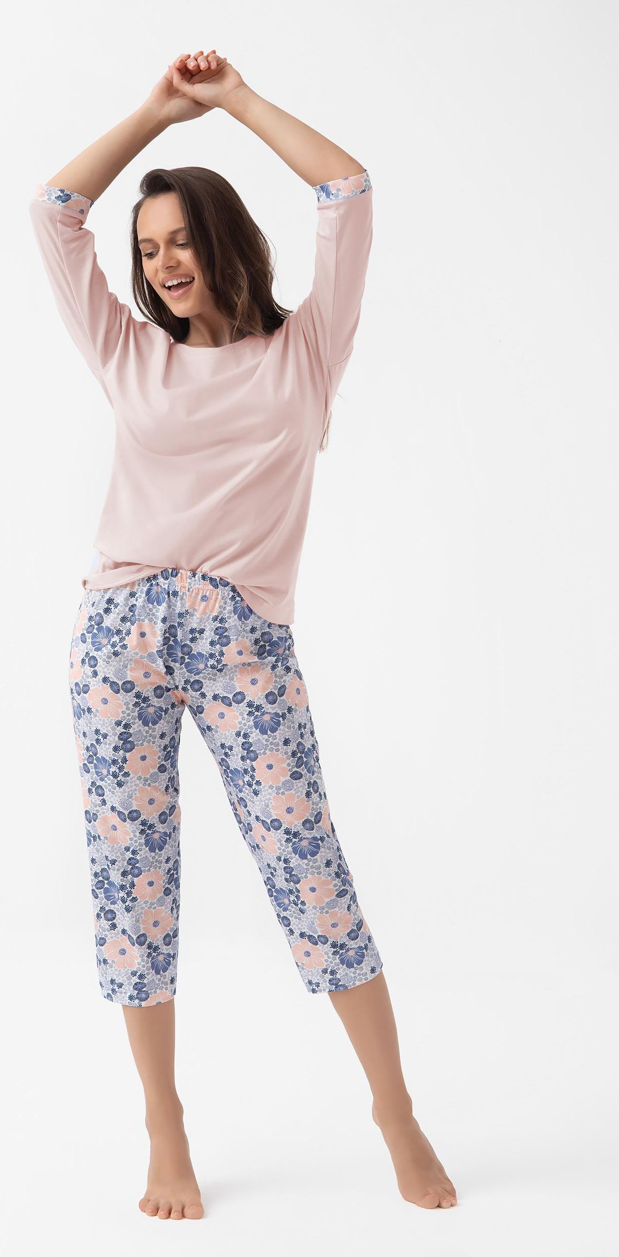 Piżama damska marki Luna wykonana z miękkiej, oddychającej bawełnianej dzianiny w eleganckim morelowym kolorze. Góra o prostym kroju, z rękawami o długości 3/4, zapewnia swobodę ruchów i komfort na co dzień. Spodnie o długości 3/4, ozdobione są kwiatowym wzorem, dodając całości kobiecego wdzięku. …