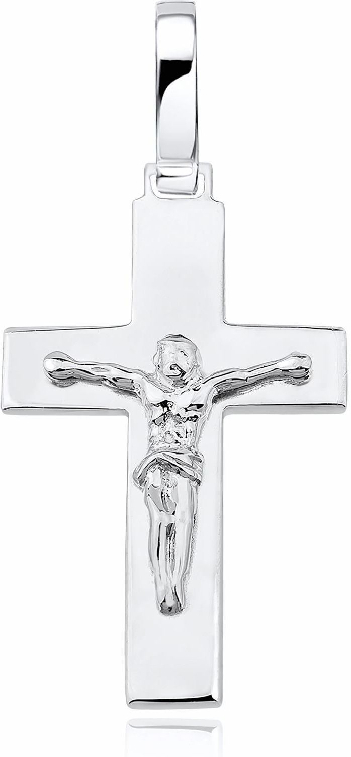 Elegancki polerowany na wysoki połysk rodowany srebrny duży krzyżyk, zdobiony wizerunkiem Chrystusa.