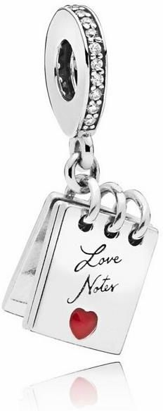 Elegancki wykonany z rodowanego srebra charms pasujący do bransolet modułowych, o kształcie przypominającym notes miłości z trzema ruchomymi kartkami oraz zawieszką wysadzaną białymi cyrkoniami, model BEADNEW5.