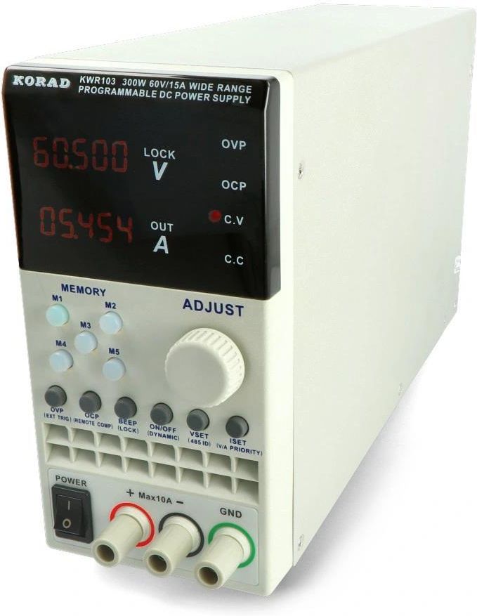 Korad KWR103 - zasilacz laboratoryjny 0-60V 15A Opis Zasilacz laboratoryjny z programowalną pamięcią i płynną regulacją napięcia w zakresie od 0 do 60 V oraz płynną regulacją prądu w zakresie od 0 do 15 A. Może pracować w trybach: C.V. - stałego napięcia wyjściowego oraz C.C. stałego prądu …
