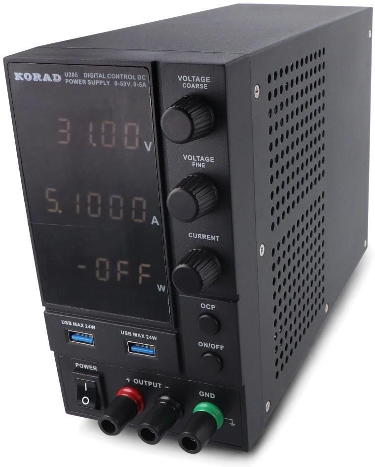 Zasilacz laboratoryjny Korad U206 to urządzenie oferujące regulację napięcia od 0 V do 60 V oraz prądu od 0 A do 5 A, dzięki czemu sprawdza się świetnie w bardziej wymagających zastosowaniach elektronicznych. Posiada dwa wbudowane porty USB 24 W do szybkiego ładowania urządzeń i wyświetlacz LED do dokładnego monitorowania parametrów.
