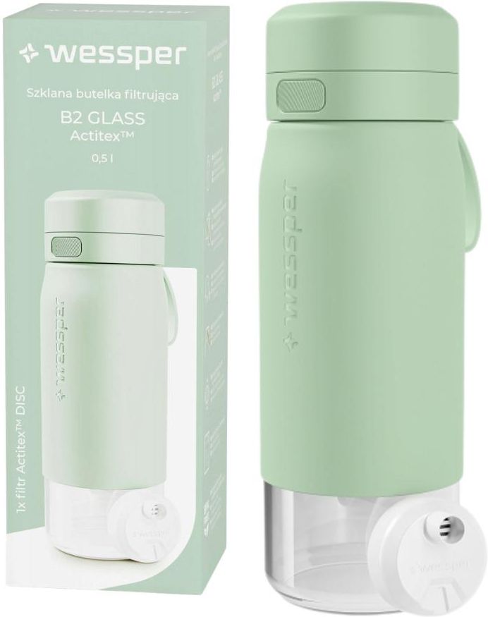 Butelka filtrująca Wessper B2 GLASS Actitex™ to funkcjonalna szklana butelka stworzona z myślą o osobach, które chcą pić czystą i smaczną wodę niezależnie od miejsca - w podróży, na treningu czy w pracy. Wykonana z wysokiej jakości szkła borokrzemowego odpornego na zarysowania i zmiany temperatury. W zakrętce butelki umieszczono wskaźnik wymiany filtra, przypominający o jego regularnej wymianie. Butelka filtracyjna szklana B2 GLASS 0,5l Wessper - Miętowa Butelka filtrująca Wessper B2 GLASS Actitex™ to funkcjonalna szklana butelka stworzona z myślą o osobach, które chcą pić czystą i smaczną wodę niezależnie od miejsca - w podróży, na treningu czy w pracy. Wykonana z wysokiej jakości szkła borokrzemowego odpornego na zarysowania i zmiany temperatury. W zakrętce butelki umieszczono wskaźnik wymiany filtra, przypominający o jego regularnej wymianie. Zestaw zawiera Butelkę filtrującą Wessper B2 GLASS Actitex™ w kolorze miętowyn Filtr Wessper Actitex™ DISC - 1szt Dbaj o środowisko i korzystaj z butelki wielokrotnego użytku! Filtr Wessper Actitex™ Disc Filtr Actitex™ DISC marki Wessper przeznaczony do butelek został stworzony z wysoce mikroporowatej włókniny z węgla aktywnego, która gwarantuje najwyższą jakość filtracji. Nano włóknina Actitex™ pozwala filtrować wodę w krótszym czasie, zapewniając znakomitą skuteczność w usuwaniu chloru, szkodliwych substancji i nieprzyjemnych zapachów. Wykonany z tworzywa wolnego od BPA (bisfenolA). Zalety butelki B2 GLASS Duża pojemność - 500ml Wolna od szkodliwego BPA Wykonana ze szkła borokrzemowego odpornego na zarysowania Wyposażona w filtr z mikroporowatej włókniny z węgla aktywnego Wbudowany licznik wymiany filtra Posiada łatwo otwierany, szczelny ustnik oraz uchwyt do wygodnego przenoszenia Możliwość mycia w zmywarce (bez filtra) Pasuje do uchwytów rowerowych i samochodowych Ekologiczna i ekonomiczna – pozwala zaoszczędzić pieniądze i ograniczyć zakupy wody butelkowanej Szczegółowe informacje Pojemność: 500 ml Kolor: Miętowy Materiał: Szkło borokrzemowe Żywotność filtra: do 200l Wymiary (szer. x wys.): ok. 7 cm x 23,5 cm Opakowanie: Kartonowe pudełko Czyszczenie: Butelkę można myć w zmywarce W naszym sklepie znajdziesz również inne modele butelek marki Wessper. Przejdź do: Butelki marki Wessper – inne modele