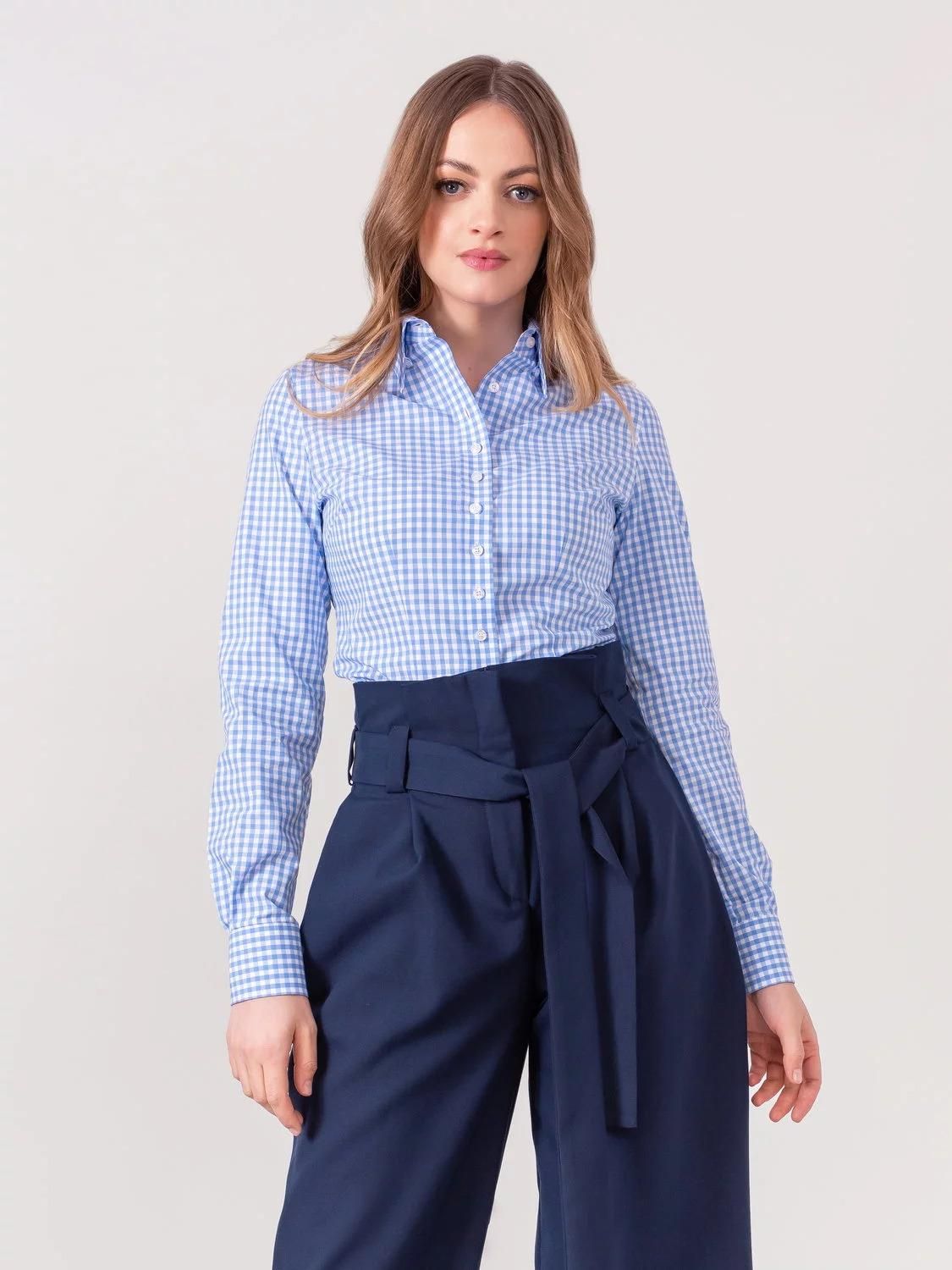Koszula damska w niebieską i białą kratkę gingham z krytym podpinanym kołnierzykiem, 100% bawełny