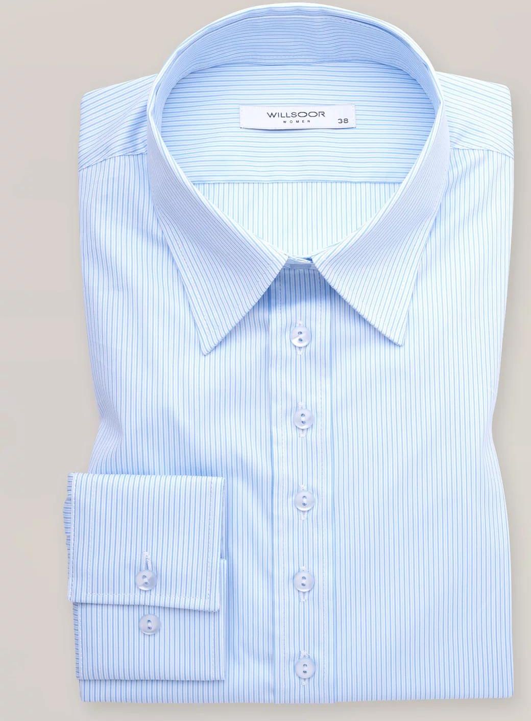 Biała, taliowana koszula damska w błękitne paski z krytym, podpinanym kołnierzykiem, tkanina z dodatkiem elastanu