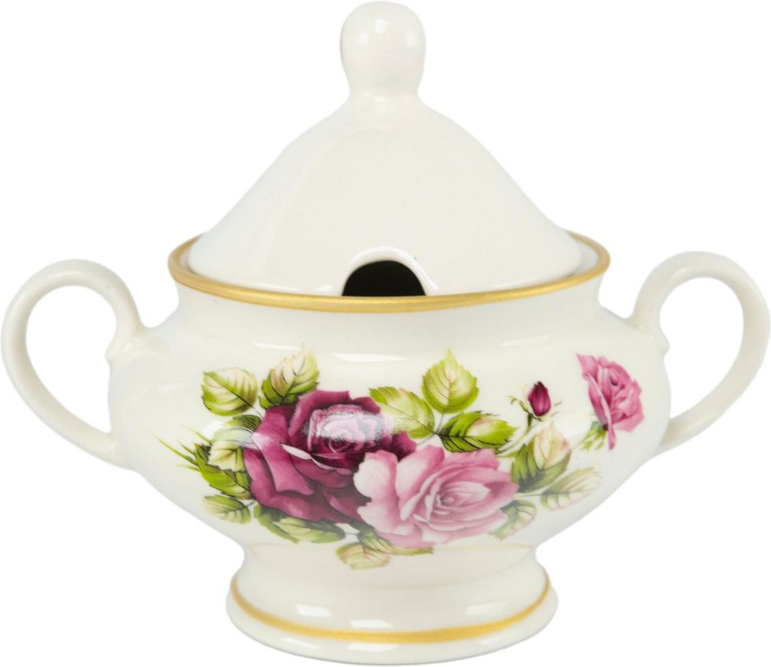 Cukiernica w kolorze kremowym. Ozdobiona motywem róż. Wykonany z użytkowej ceramiki szlachetnej. Wyprodukowany w Polsce przez fabrykę ceramiki szlachetnej w Mieroszowie. Ceramikę można myć w domowych zmywarkach. Wzór: róże (produkt wykonany ręcznie, układ kwiatów może się różnić od tego na zdjęciach) Produkt 1 x cukiernica Wymiary wysokość cukiernicy z pokrywką: 14 cm pojemność: 320 ml Materiał ceramika szlachetna Użytkowanie zmywarka dopuszczone do kontaktu z żywnością
