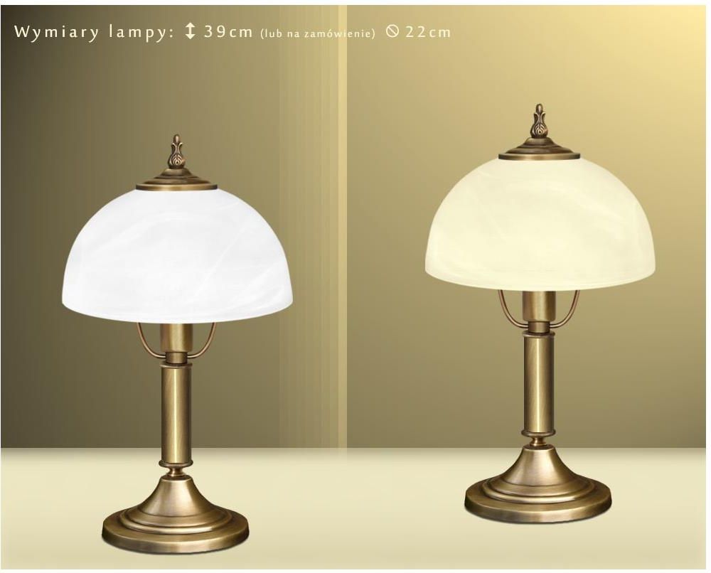 Lampka mosiężna biurkowa / stołowa. - Wykonana w całości z elementów z pełnego mosiądzu. Mosiądz to trwały, szlachetny i ponadczasowy materiał - kliknij, aby dowiedzieć się więcej. - Wykończenie mosiądzu: złota patyna. - Klosz szklany do wyboru: biały ‘alabaster’ lub ecru ‘alabaster’ (albo na zamówienie ecru gładki w zależności od dostępności). - Wymiary całkowite: wysokość 39cm, średnica 22cm. - W podstawie lampy umieszczony jest odważnik zapewniający jej stabilność.- Włącznik na przewodzie zasilającym (przewód w kolorze lampy wyprowadzony jest z boku podstawy). - Żródło światła: 1xE14 (żarówka tradycyjna/żarowa o mocy max. 40W) lub żarówka energooszczędna albo LED o większej mocy (np. 80W). Lampa jest fabrycznie nowa, wyprodukowana w Polsce. Gwarancja: 24 miesiące. Seria M - zobacz wszystkie lampy