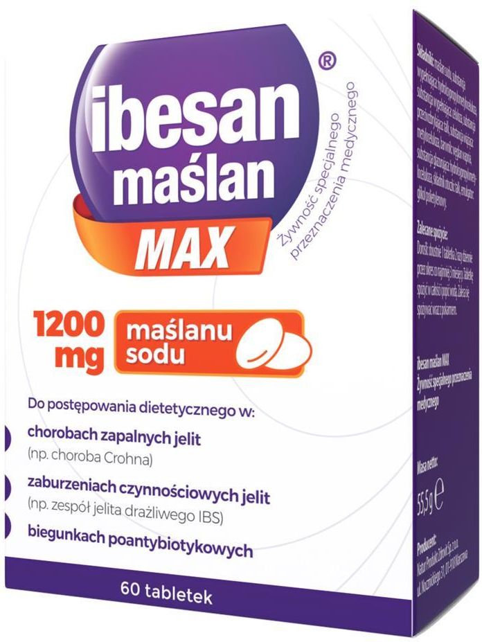 Żywność specjalnego przeznaczenia medycznego Ibesan maślan MAX, 60tabletek Właściwości Do stosowania w postępowaniu dietetycznym w: chorobach zapalnych jelit, zaburzeniach czynności jelit, w biegunkach po antybiotykowych, w stanach po zabiegach diagnostycznych i chirurgicznych, diecie ubogiej w …