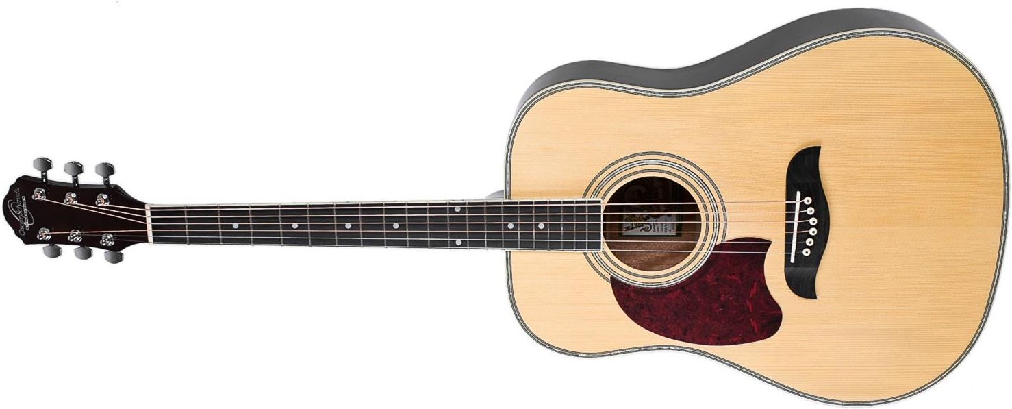Kolor producenta: Natural, Kolor: Natural, Wykończenie: Połysk, Typ: Dreadnought, Wykrojony otwór: Nie, Korpus: Warstwowy, Płyta przednia: Świerk, Płyta tylna: Mahoń, Boki: Mahoń, Szyjka: Mahoń, Menzura: 650 mm, Ilość progów: 20, Rozmiar prógu zerowego: 43 mm, Gryf: Tech Wood, Mostek: Tech Wood, Próg zerowy: NuBone, Przetwornik: Nie, Rodzaj przetwornika: Nie zawiera, Model elektroniczny: N/A, Sterowanie: N/A, Tuner zintegrowany: Nie, Tunery: Oscar Schmidt, Hardware: Chrom, Futerał: Nie, Pokrowiec: Nie, Struny: N/A, Kraj pochodzenia: Chiny,