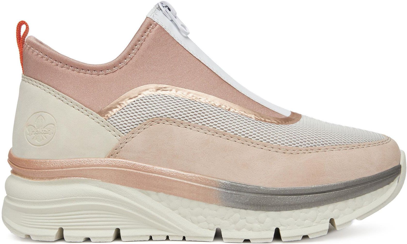 Sneakersy damskie Rieker w jasnobeżowym kolorze to esencja wygody i stylu. Wykonane z włókienniczego materiału, zapewniają komfort i przewiewność, idealne na każdą porę roku. Okrągły nosek daje swobodę palcom, co jest kluczowe podczas długiego noszenia. Zapięcie na suwak ułatwia szybkie zakładanie i zdejmowanie butów, oferując jednocześnie świetne dopasowanie. Technologia Rieker Antistress redukuje zmęczenie stóp, zapewniając wyjątkowy komfort przez cały dzień. Te sneakersy to doskonały wybór dla kobiet, które cenią wygodę bez kompromisów w kwestii stylu. Idealne na co dzień i do miejskich stylizacji! Od ponad stu lat marka Rieker oferuje niezwykle komfortowe i trwałe obuwie, które powstaje z myślą o zdrowiu stóp. Dzięki wieloletniemu doświadczeniu w produkcji obuwia, ta niemiecka marka doskonale potrafi łączyć wygodę ze stylem, dlatego w ofercie znajdziesz buty w modnych, oryginalnych fasonach, które każdemu przypadną do gustu. Buty Rieker tworzone są z materiałów wysokiej jakości, przez co odznaczają się wyjątkową elastycznością i trwałością, ale też lekkością. Ponadto w obuwiu stosuje się szerszą formę zapewniającą odpowiednią stabilizację stopy, specjalne podeszwy absorbujące wstrząsy oraz odciążające stawy i kręgosłup, a także wyjmowane wkładki z pianki Memory Foam, która idealnie dopasowuje się do kształtu stóp. To doskonałe produkty dla tych, którzy ponad wszystko cenią sobie komfort. Przekonaj się!