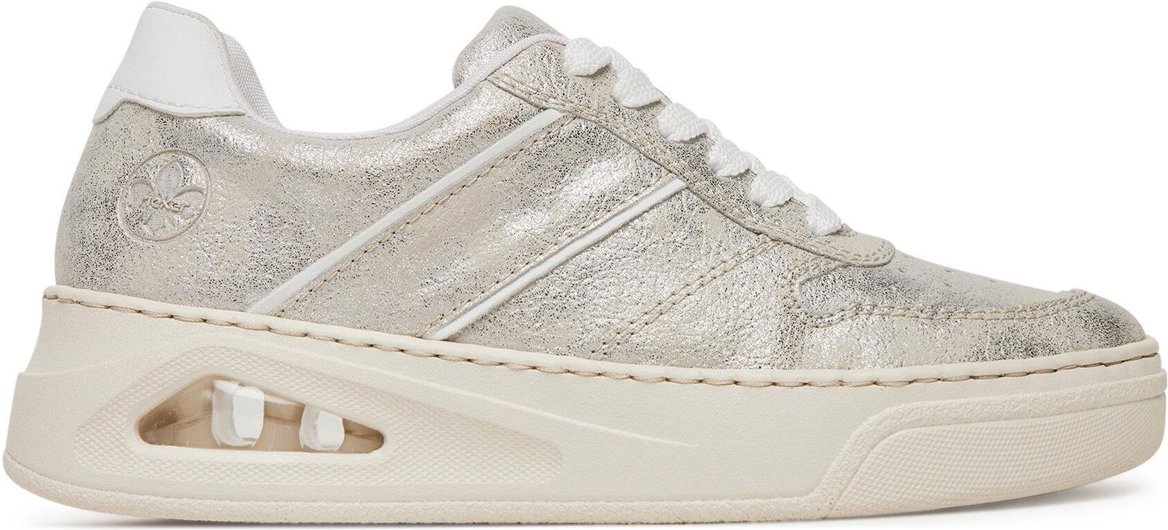 Srebrne sneakersy damskie Rieker to idealny wybór dla kobiet ceniących komfort i styl. Wykonane z wysokogatunkowego tworzywa syntetycznego, zapewniają trwałość i wygodę przez cały dzień. Sznurowanie umożliwia perfekcyjne dopasowanie butów do stóp, a płaska podeszwa z platformą dodaje subtelnej wysokości, jednocześnie gwarantując stabilność i komfort noszenia. Uniwersalny srebrny kolor sprawia, że sneakersy doskonale komponują się z różnymi stylizacjami, zarówno sportowymi, jak i casualowymi. To obuwie, które łączy nowoczesny design z funkcjonalnością, idealne na każdy dzień. Musisz je mieć! Od ponad stu lat marka Rieker oferuje niezwykle komfortowe i trwałe obuwie, które powstaje z myślą o zdrowiu stóp. Dzięki wieloletniemu doświadczeniu w produkcji obuwia, ta niemiecka marka doskonale potrafi łączyć wygodę ze stylem, dlatego w ofercie znajdziesz buty w modnych, oryginalnych fasonach, które każdemu przypadną do gustu. Buty Rieker tworzone są z materiałów wysokiej jakości, przez co odznaczają się wyjątkową elastycznością i trwałością, ale też lekkością. Ponadto w obuwiu stosuje się szerszą formę zapewniającą odpowiednią stabilizację stopy, specjalne podeszwy absorbujące wstrząsy oraz odciążające stawy i kręgosłup, a także wyjmowane wkładki z pianki Memory Foam, która idealnie dopasowuje się do kształtu stóp. To doskonałe produkty dla tych, którzy ponad wszystko cenią sobie komfort. Przekonaj się!