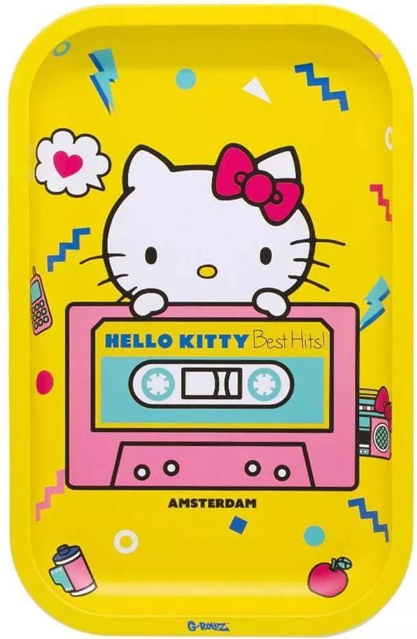 Tacka do skręcania G-Rollz Hello Kitty Best Hits 17.5x27.5 cm Tacka do jointów G-Rollz z unikatowym nadrukiem Hello Kitty z limitowanej kolekcji. Wykonana z metalu. Posiada podwyższone brzegi, które zapobiegają wysypywaniu się suszu w trakcie skręcania. Duży rozmiar bez problemu pomieści bletki, filterki, zapalniczkę, susz.
