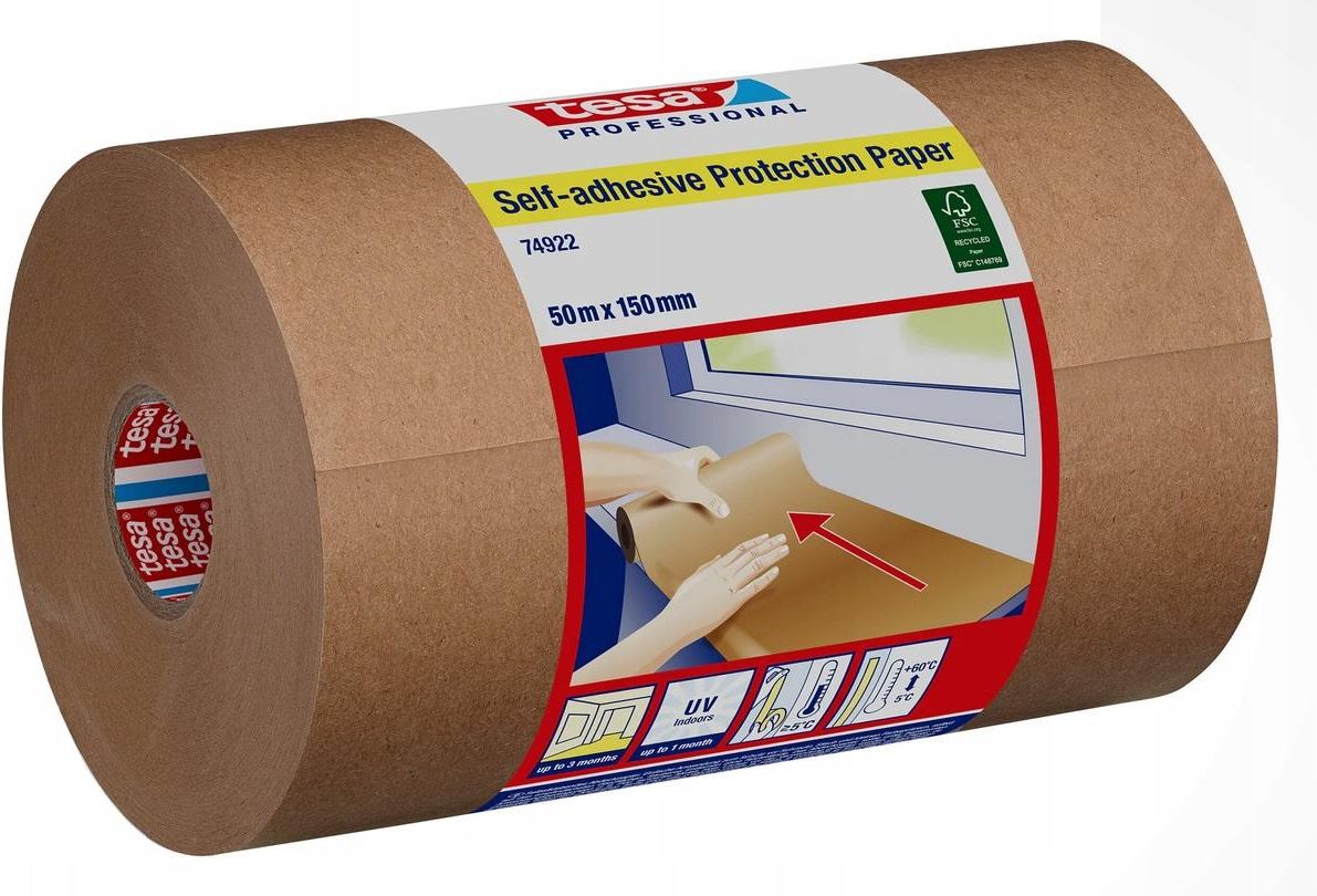 Tesa® 74922 Samoprzylepny papier ochronny 150mm/50mSamoprzylepny papier ochronny tesa® – do zabezpieczania i pokrywania dużych powierzchni Opis produktu Samoprzylepny papier ochronny tesa® to profesjonalnej jakości papier kraftowy, idealny do zabezpieczania dużychpowierzchni podczas prac malarskich lub remontowych. Zapewnia łatwą i skuteczną ochronę przed rozlaniem farbyi zadrapaniami na różnych powierzchniach, takich jak parapety, schody, podłogi i blaty. Jest łatwy do nałożenia,przesuwania i odklejania bez pozostawiania substancji klejącej, co oznacza bezproblemowe czyszczenie. Aspekty zrównoważonego rozwoju Samoprzylepny papier ochronny tesa® jest wytwarzany z papieru pochodzącego z odpowiedzialnie zarządzanychlasów i innych kontrolowanych źródeł. Spełnia standardy FSC® dla recyklingowanego papieru, ponieważ jest wykonanyw 100% z włókien z recyklingu. Wybierając ten papier ochronny, aktywnie wspierasz ochronę lasów i dokonujeszodpowiedzialnego środowiskowo wyboru. Pomaga oszczędzać cenne zasoby i sprzyja recyklingowi – idealny dlakażdego, kto w swoich projektach ceni jakość i zrównoważony rozwój. Osłaniaj swoje powierzchnie w odpowiedzialnysposób, wybierając samoprzylepny papier ochronny tesa®!Ważna uwaga: Informacja o certyfikacie FSC® dotyczy wyłącznie firm posiadających certyfikat FSC® (FSC® C148769). Cechy • Łatwa aplikacja, zapewniająca ochronę nawet najbardziej delikatnych powierzchni przed zabrudzeniami, kurzemi drobnymi odpryskami farby• Czyste usuwanie bez pozostawiania śladów – do 1 miesiąca• Możliwość wielokrotnego nakładania• W pełni powlekany nośnik zwiększający trwałość i wydajność• Gładki i gruby papier kraftowy zapobiegający przenikaniu farby• W skład zestawu wchodzą: 1 rolka samoprzylepnego papieru ochronnego tesa Ocena właściwości wydłużenie przy zerwaniu 2.5 % odporność na rozciąganie 500 N/cm Odporność UV do wnętrz 90 g/m² Materiał Papier materiał dobrze maskujący papier nadaje się do delikatnych powierzchni yes usuwanie bez pozostawiania śladów tak Application temperature from 5 °C łatwo usuwalna tak Odporność na rozdarcie nie Waga nośnika 4 weeks odporność na wilgoć niska Temperatura stosowania do 60 °C Bez rozpuszczalników tak Usuwanie bez śladu do ... dni 90 days wodoodporność nie