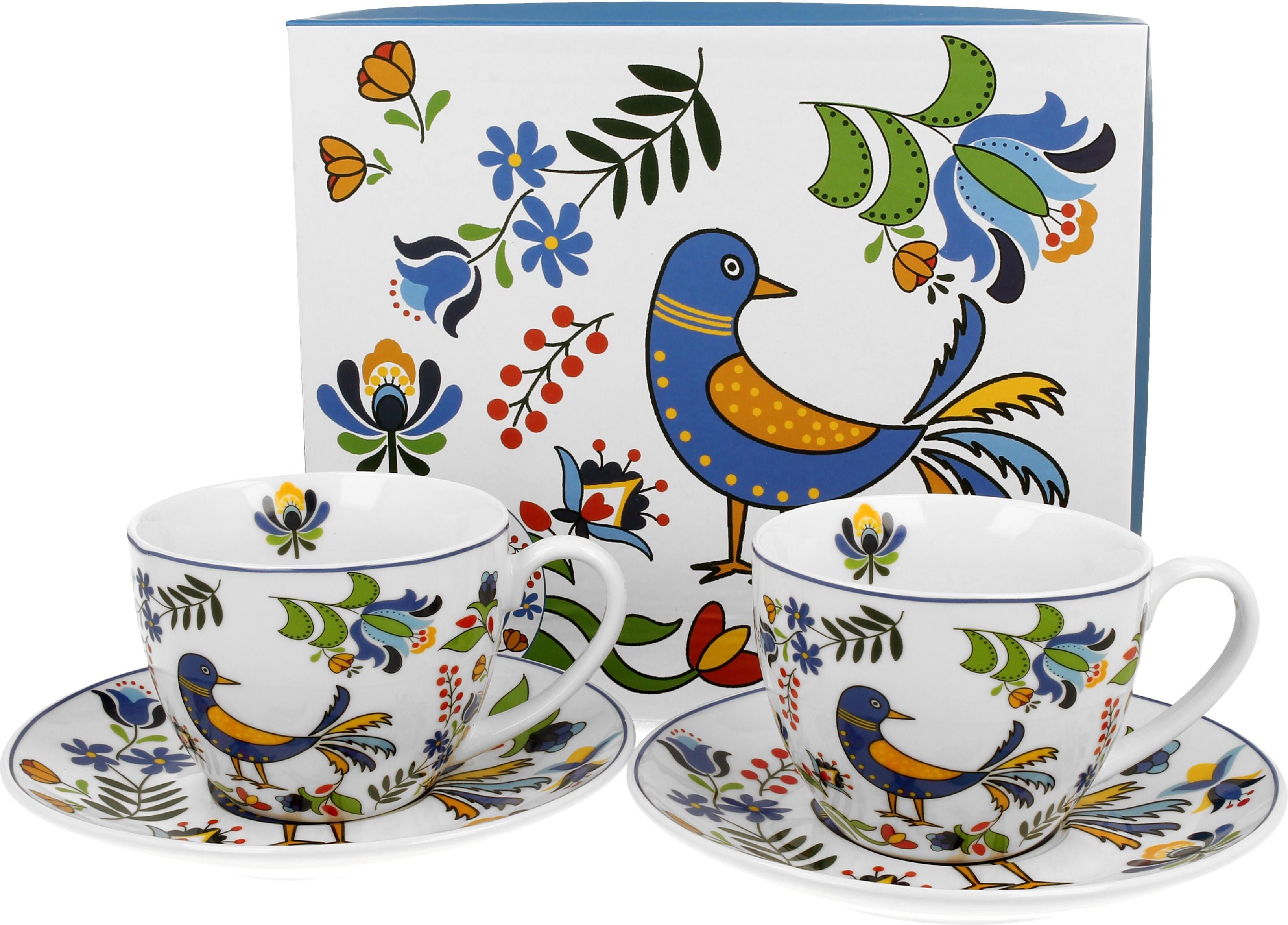 Komplet 2 filiżanek ze spodkami PTASZEK KASZUBSKI to prawdziwe dzieło sztuki, które z pewnością przyciągnie uwagę każdego miłośnika pięknych i funkcjonalnych przedmiotów. To połączenie tradycyjnego malarstwa i nowoczesnego designu. Każda filiżanka to małe dzieło sztuki, które wprowadzi do Twojego domu atmosferę ciepła i elegancji. Wyjątkowy design: Filiżanki i spodki zdobią kolorowe ilustracje ptaków i kwiatów w stylu folkowym, które dodadzą uroku Twoim codziennym chwilom przy kawie lub herbacie. Jakość: Filiżanki wykonane są z najwyższej jakości porcelany, gwarantujących trwałość i odporność na uszkodzenia. Idealny prezent: Zestaw zapakowany jest w ozdobny kartonik z tym samym motywem, co czyni go idealnym prezentem dla bliskiej osoby. Unikalność: Wzór kaszubski jest jedyny w swoim rodzaju. Wykorzystuje motyw kwiatu róży, tulipana oraz owocu granatu. Pojawiają się tutaj delikatne kwiaty i pąki na charakterystycznych wąsach. Zakup zestawu 2 filiżanek ze spodkami PTASZEK KASZUBSKI to inwestycja w piękno i funkcjonalność, ale także sposób na wprowadzenie do swojego domu odrobiny tradycji i kultury kaszubskiej. Nie czekaj, poczuj magię wzoru kaszubskiego już dziś! Dane produktu Materiał: Porcelana New Bone China Pojemność maksymalna: 250 ml Średnica: 9 cm Wysokość: 7 cm Szerokość z uchem: 12 cm Średnica spodka: 15,3 cm Zastosowanie Zmywarka: Tak Mikrofalówka: Tak Giftbox Szerokość pudełka: 18 cm Długość pudełka: 21,5 cm Wysokość pudełka: 9,5 cm Firma Duo Gift, z siedzibą w Polsce, jest dumna z swojej historii, która sięga końca lat 90’. Od tego czasu, misja firmy polegała na wprowadzaniu na rynek wyjątkowej porcelany prezentowej, która wyróżnia się na tle codziennych zastaw stołowych. Dzięki ciężkiej pracy i nieustannemu dążeniu do doskonałości, zdobyli ogromne doświadczenie, które pozwoliło zbudować im solidną markę, rozpoznawalną nie tylko w Polsce, ale na całym świecie. Ich zaangażowanie w jakość i innowacje zaowocowało zaufaniem klientów, które stale wzmacniane jest poprzez prezentację produktów na najważniejszych targach branżowych, zarówno w Polsce, jak i w takich europejskich metropoliach jak Frankfurt, Paryż i Mediolan. Zapraszamy do odkrycia świata Duo Gift - miejsca, gdzie porcelana staje się sztuką.