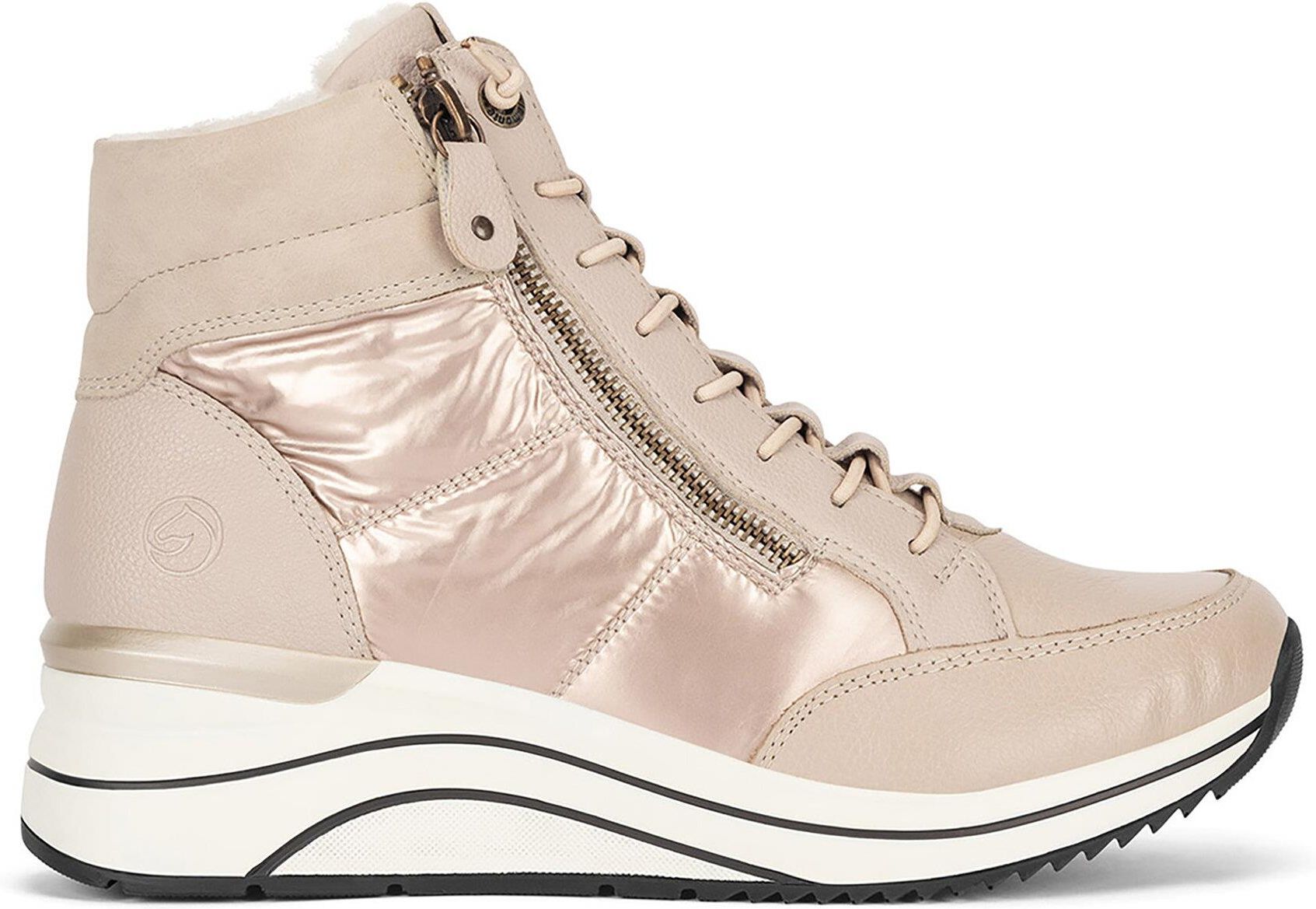 Trzewiki damskie od marki Remonte to idealny wybór dla kobiet, ceniących styl i wygodę. Utrzymane w eleganckim, beżowym kolorze, doskonale wpisują się w casualowy styl, będąc świetnym dopełnieniem każdej codziennej stylizacji. Wykonane z wysokiej jakości skóry, gwarantują trwałość i komfort noszenia. Buty sięgają za kostkę, zapewniając dodatkowe wsparcie i ochronę. Dzięki praktycznemu zapięciu na suwak, zakładanie i zdejmowanie butów jest szybkie i bezproblemowe. Koturny nadają sylwetce lekkości i dodają kilku centymetrów wzrostu, podkreślając przy tym kobiecy charakter obuwia. Marka Remonte to szwajcarska firma obuwnicza, w której ofercie znajdziemy botki, półbuty i sandały damskie wykonane z iście szwajcarską precyzją. Marka stawia na ponadczasowe fasony w nowoczesnym wydaniu, dlatego w większości modeli wykorzystuje materiały wysokiej jakości, jak skóra naturalna, które poza atrakcyjnym designem, oferują też trwałość i wytrzymałość. Buty Remonte projektowane są z myślą o tych osobach, które cenią sobie komfort i wygodę. Są lekkie, elastyczne, a ich konstrukcja pozwala chodzić w nich przez cały dzień bez uczucia zmęczenia. Poznaj ofertę marki Remonte w CCC!