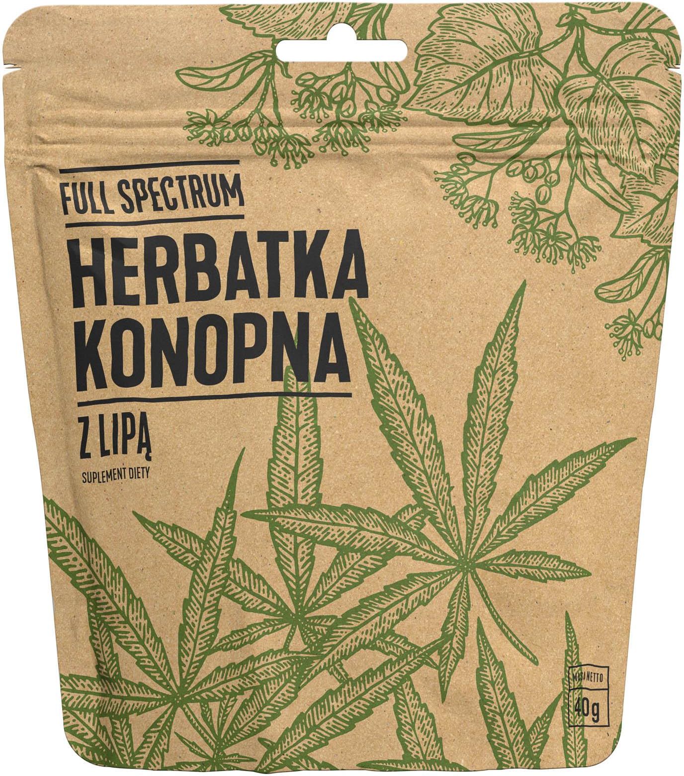 Suplement diety Full Spectrum, Herbatka Konopna z Lipą, 40g Składniki Wysuszone i rozdrobnione liście konopi włóknistych (Cannabis Sativa L) - [50%], Kwiat lipy (Tilia spp.) - [50%] Zalecana dzienna porcja produktu do spożycia 5g (4 łyżeczki), zalecana dzienna porcja zawiera 2500mg Cannabis Sativa …