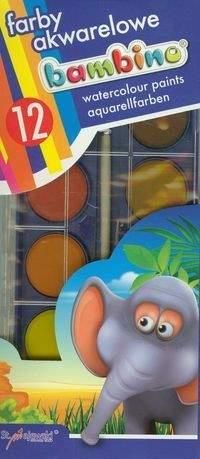 Farby akwarelowe Bambino, 12 kolorów Cechy produktu: farby wodne w postaci suchych pastylek gotowe do użycia po zwilżeniu wodą dedykowane dzieciom i młodzieży bogata paleta intensywnych kolorów idealne do malowania pejzaży i portretów pozwalają uzyskiwać efekty świetlistości, delikatności, rozmycia konturów, grę światła można ich używać w technikach łączonych z farbami plakatowymi, temperą czy różnego rodzaju kredkami spełniają wymagania zasadnicze dyrektywy Parlamentu Europejskiego i Rady 2009/48/WE z dnia 18 czerwca 2009 w sprawie bezpieczeństwa zabawek oraz wymogi odpowiednich norm zharmonizowanych ilość kolorów – 12