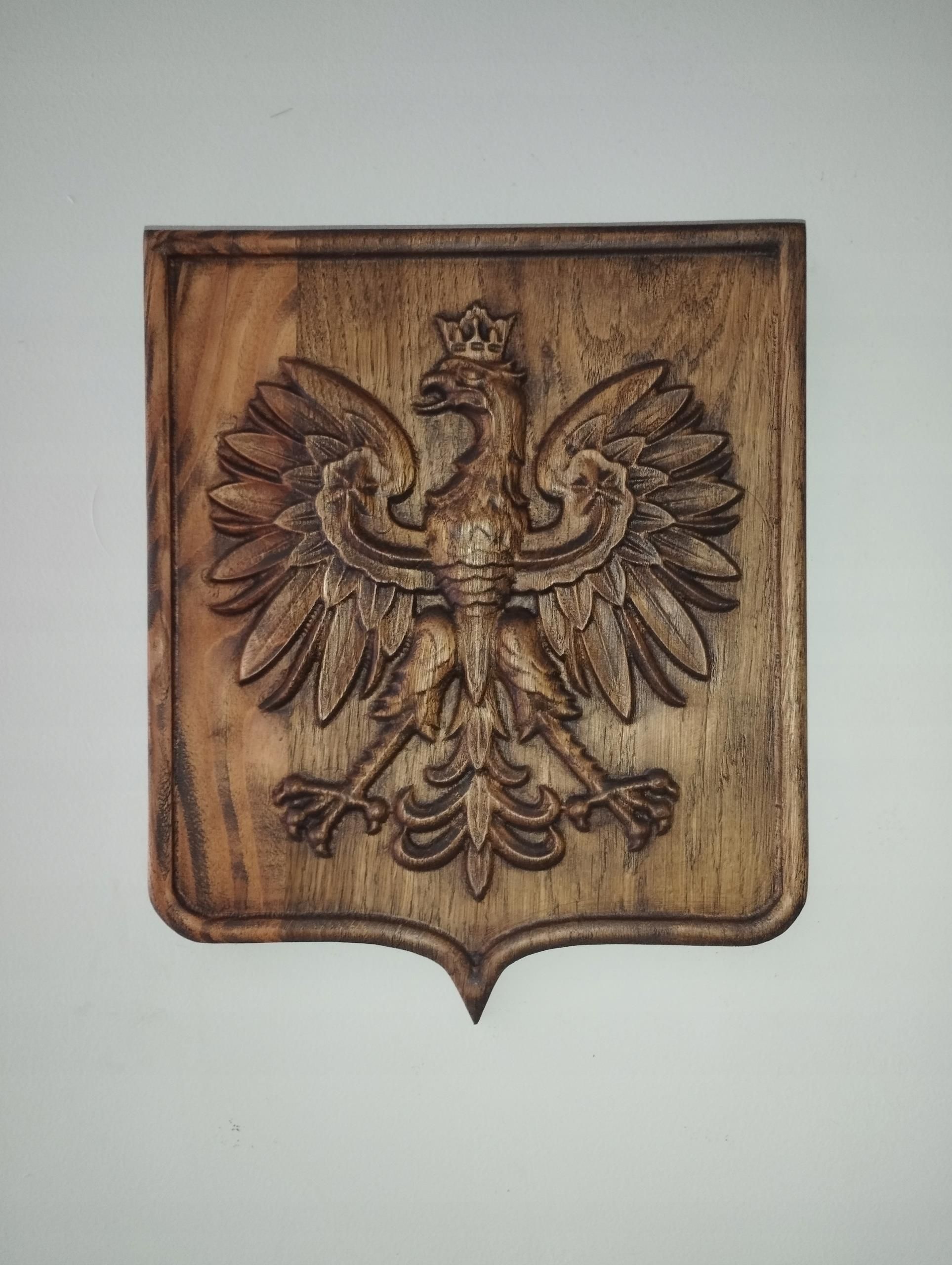 godło Polski drewno płaskorzeżba w jednym kawałku drewna zapuszczone i zapolerowane woskiem do drewna ,co czyni go odpornym na wszelkie warunki atmosferyczne wysokość ok 30cmtylna zawieszka każde godło może się różnić od siebie ze względu na użyte drewnoużywamy zazwyczaj drewna dębowego ,sosny lub modrzewia drewno najwyższej klasy sezonowane