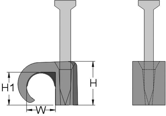 Uchwyty do przewodów okrągłych (flop)do mocowania i układania przewodów, optymalny kształt dla pewnego umocowania przewodu, układanie na przewodzie, wykonane z ocynkowanym gwoździem stalowym, materiał: odporny na uderzenia polietylen ( PE), wolny od halogenu, odporny na temperaturę: -40º C do +80º C, chwilowo do ok. 100º C. DG=długość gwoździa PG=przekrój gwoździa H=wysokość H1=wysokość 1 W=szerokość otworu