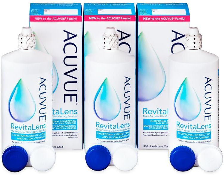 Płyny do soczewek ACUVUE Revitalens 3x 360 ml + 3 pojemniczki Data ważności 31-12-2025 Płyn Acuvue RevitaLens firmy Johnson&Johnson zapewnia długotrwałe szerokie spektrum ochrony przeciwbakteryjnej. Zmniejsza ryzyko wystąpienie podrażnie, ma doskonałe właściwości czyszczace. Usuwa proteiny i lipidy z powierzchni soczewki kontaktowej. Przede wszystkim na pozytywny wpływ na komfort noszenia soczewek. Skuteczność płynów wielofunkcyjnych została przetestowana i porównana pod względem skuteczności w niszczeniu mikroorganizmów w teście ISO. Płyn Acuvue RevitaLens osiągnął bardzo dobry wynik, aż 99.99% po 6 godzinach testowania. Do czyszczenia soczewek płynem pielęgnacyjnym zaleca się pocieranie powierzchni soczewek z obu stron puszkiem palca przez ok. 10 sekund przed umieszczeniem ich w pojemniczku z płynem na noc, tak aby soczewki wyczyścić od osadów i poddać bardziej efektywnej dezynfekcji.