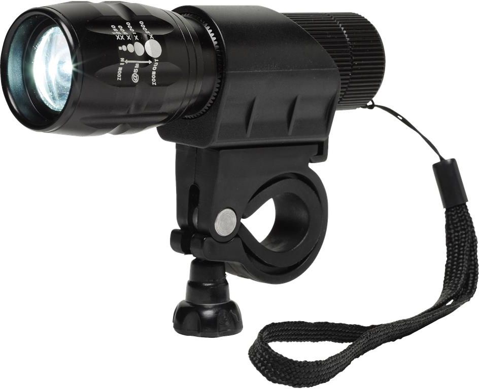 Połączenie lampki rowerowej i latarki. Trzy tryby świecenia i regulacja wiązki światła. W zestawie uchwyt do kierownicy. Produkt zasilany trzema bateriami AAA (do kupienia osobno).