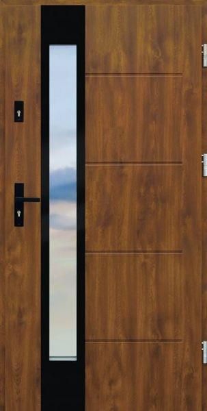 Drzwi wejściowe z kolekcji LIBERTO wyróżnia tłoczona powierzchnia skrzydła oraz panel dekoracyjny ze szczotkowanego aluminium anodowanego na czarno.