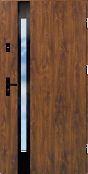 Drzwi wejściowe z kolekcji OLIVIO GLASS wyróżnia zdobienie panelem dekoracyjnym wykonanym z hartowanego szkła a od strony wewnętrznej z anodowanego na czarno aluminium.