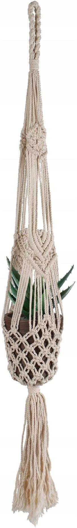 MAKRAMA NA DONICZKĘ ZE SZNURKA BAWEŁNIANEGO 115h cm KOD: MAKRAMA.24 Wysokość (cm): 115 Surowiec: Sznurek bawełniany KWIETNIK ZE SZNURKA BAWEŁNIANEGO NA DONICZKĘ 115h cm Makrama - kwietnik wypleciony ze sznurka bawełnianego może z powodzeniem wraz z odpowiednio dobranymi roślinami (idealna na bluszcz, paproć, hoję, trzykrotkę, starzec itd.) w uroczy sposób ukwiecać przez cały rok bez zabierania cennych metrów kwadratowych każde miejsce w domu, natomiast w te cieplejsze i pogodne dni ozdabiać także otoczenie domu - balkon lub taras (odpowiednia w tym przypadku na pelargonię wiszącą, petunię, fuksję, komarzycę i wiele innych). Makrama jest bardzo plastyczna, sznurki rozciągają się, więc możesz włożyć do kwietnika zarówno mniejszą, jak i nieco większą doniczkę pamiętając jedynie o równomiernym rozłożeniu sznurków. Wystarczy, że włożone go makramy kwiaty i rośliny zielone będziesz dostosowywać do zmieniającej się pory roku i całoroczna dekoracja domu oraz przydomowej strefy za dosłownie kilkanaście złotych gotowa! Przeznaczenie: makrama na doniczkę, duża makrama na donicę, kwietnik makrama, kwietnik boho makrama, dekoracje boho do domu SPECYFIKACJA Wymiary makramy*: wysokość całkowita: ok. 115 cm Cechy produktu: wypleciony ze sznurka bawełnianego; rękodzieło; niebarwiony; kolor kremowy; miejsce na 1 doniczkę; przeznaczenie: do powieszenia na ścianie. * wymiary mogą się nieznacznie różnić od podanych ze względu na ręczne wykonanie z naturalnego materiału