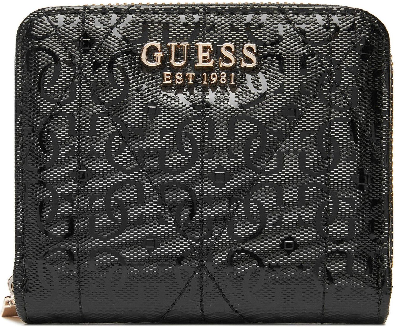 Portfel Guess wymiary: 11 x 10 x 2 cm materiał: 100% poliuretan kolor okuć: jasne złoto skóra syntetyczna po zewnętrznej stronie 4 miejsca na karty jedna przegródka na banknoty kieszeń na bilon zamykana na zatrzask metalowe logo gwarancja producenta 2 lata