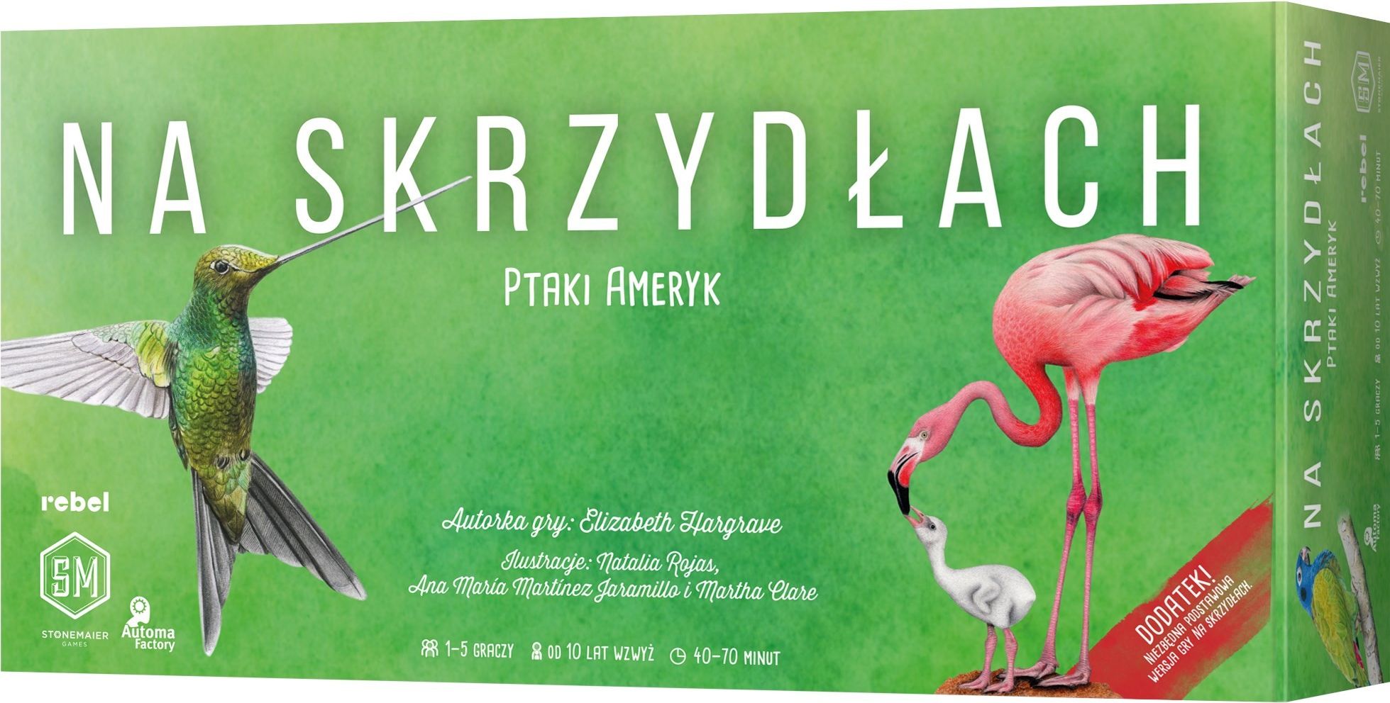 PRZEDSPRZEDAŻ! UWAGA! DATA PREMIERY / TERMIN WYSYŁKI MOŻE ULEC ZMIANIE! Wprowadź amerykańskie ptaki do swoich rozgrywek w Na skrzydłach Meksyk, Ameryka Centralna, Ameryka Południowa oraz Karaiby to niezwykle bioróżnorodny region, będący siedliskiem ponad 3 tysięcy gatunków ptaków. Są wśród nich te o największej i najmniejszej rozpiętości skrzydeł na świecie (odpowiednio albatros wędrowny i koliberek hawański). Szczególną grupą są kolibrowate – nie tylko stanowią około jedną dziesiątą gatunków ptaków Ameryki Łacińskiej, ale też są uwielbiane przez obserwatorów za szybkość ruchów i połyskujące upierzenie. Dodatek Na skrzydłach: Ptaki Ameryk wprowadza do gry ptaki z tego właśnie obszaru. Oprócz 111 nowych kart rozszerzających klasyczną talię, w pudełku znajdziemy też specjalną talię kolibrów, które będziemy mogli wabić i uwalniać z naszego rezerwatu, by zdobywać rozmaite korzyści takie jak dodatkowe karty czy żetony nektaru albo możliwość składania jaj. Uwolnione kolibry będą przechodziły na specjalną planszę ogrodu, a sprytne ich rozmieszczanie pozwoli na gromadzenie dodatkowych punktów. Czym jest Na skrzydłach? To przepięknie ilustrowana gra ekonomiczna, w której uczestnicy tworzą własne rezerwaty, będące ostoją dla różnorodnych gatunków ptaków. Każdy kolejny okaz to szansa nie tylko na wzbogacenie kolekcji, ale również inwestycja w rozwój i realizację celów. W miarę upływu czasu będziemy gromadzili coraz więcej wpływających na siebie wzajemnie umiejętności, a każde działanie będzie poruszało łańcuch zależności między nimi.