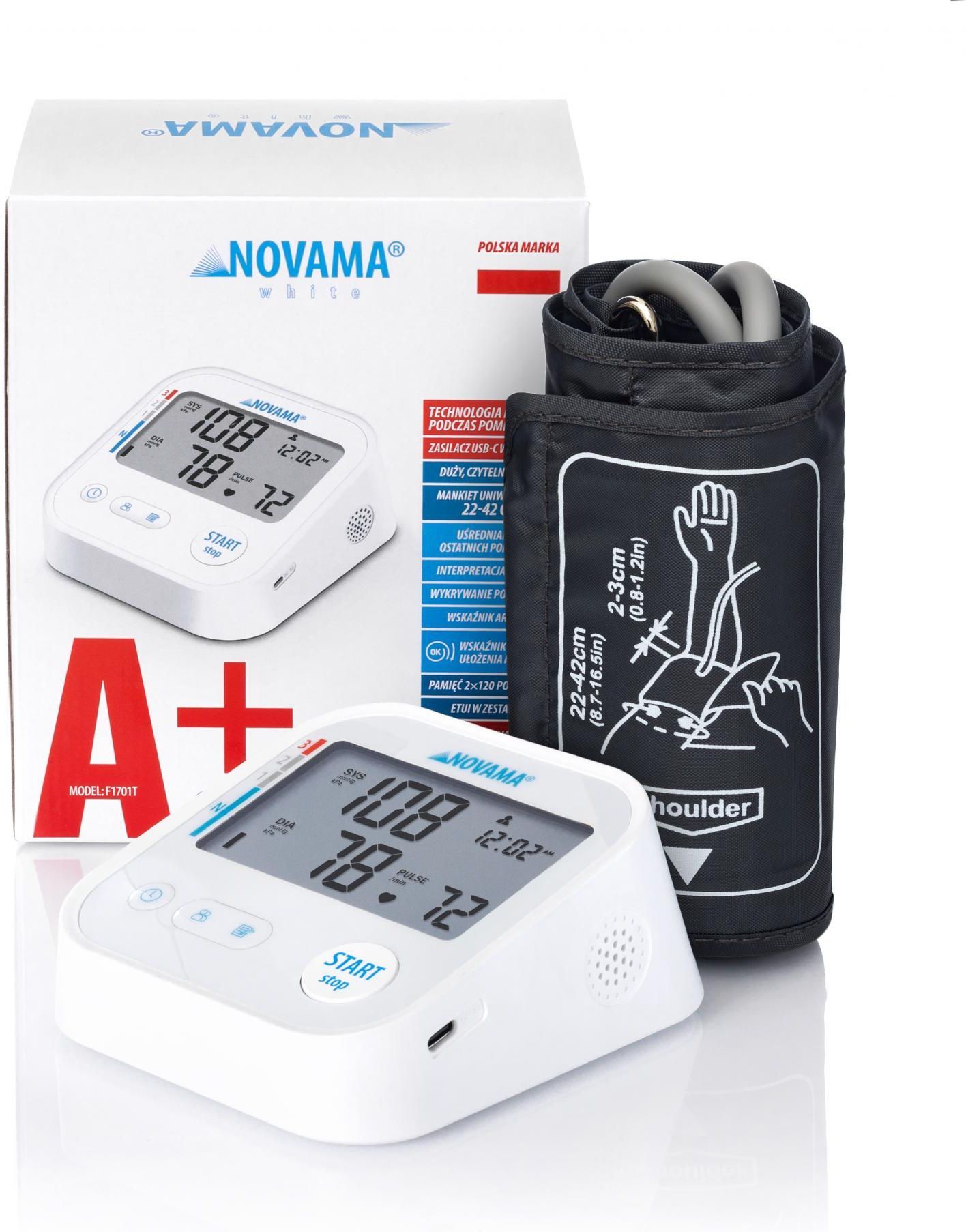 Novama White A+ Innowacyjny Ciśnieniomierz Naramienny Umożliwia regularny pomiar ciśnienia krwi w wygodny sposób, dostosowany do warunków domowych. Dzięki zastosowaniu zaawansowanych funkcji i nowoczesnych technologii, ten produkt medyczny zapewnia nie tylko precyzyjne pomiary, ale także dodatkowe korzyści dla użytkownika. Novama White A+ ma duży, czytelny ekran z panoramicznym wyświetlaczem Ułatwia wyraźne odczytanie wyników pomiarów, co przekłada się na większą czytelność i wygodę użytkowania. Ponadto, ciśnieniomierz został zaprojektowany tak, aby był niezwykle prosty w obsłudze. Wyposażony jest w wygodne, łatwo dostępne przyciski, które umożliwiają intuicyjne korzystanie z urządzenia. Jedną z głównych zalet Novama White A+ jest funkcja wykrywania arytmii. Dzięki temu użytkownik może otrzymać ostrzeżenie, gdy urządzenie wykryje nieregularny rytm serca. Ciśnieniomierz wykorzystuje technologię pomiaru podczas pompowania Pomiar ciśnienia odbywa się już podczas napełniania mankietu powietrzem. To przyspiesza i usprawnia cały proces pomiaru, zapewniając szybkie i dokładne wyniki. Novama White A+ ma zasilanie za pomocą portu USB-C (zasilacz w zestawie) lub możliwość pracy na baterie. Mankiet w rozmiarze 22-42 cm jest odpowiedni dla większości użytkowników, a pamięć dla 2 użytkowników pozwala na przechowywanie aż 240 pomiarów (2x120). Dodatkowo, ciśnieniomierz Novama White A+ posiada funkcję obliczania średniej z trzech ostatnich pomiarów, co umożliwia monitorowanie tendencji zmian ciśnienia krwi. Interpretacja wyników pomiarów jest zgodna z wytycznymi Światowej Organizacji Zdrowia (WHO), co pozwala użytkownikowi lepiej zrozumieć i ocenić swoje wyniki. Dodatkowym plusem jest etui, które jest dołączone do zestawu Novama White A+. Etui to praktyczne rozwiązanie, które pozwala na bezpieczne przechowywanie i transport ciśnieniomierza. Novama White A+ wyróżnia się również swoją trwałością i solidnością. Producent zapewnia aż 3 lata gwarancji na samą jednostkę ciśnieniomierza, co świadczy o jego jakości i niezawodności. Urządzenie informuje również o niskim poziomie baterii Automatyczne wyłączanie pomaga w oszczędzaniu energii. Wyświetlanie daty i godziny umożliwia łatwe śledzenie wyników, a wykrywanie pozycji mankietu oraz poruszenia poprawiają dokładność pomiarów. Novama White A+ wyróżnia funkcja głosowa, która dostępna jest w języku polskim Dzięki temu użytkownik może skorzystać z odczytu głosowego wyników pomiarów, co jest szczególnie przydatne dla osób z ograniczeniami wzroku lub dla tych, którzy preferują słowne komunikaty. Zalety ciśnieniomierza Novama White A+: duży czytelny ekran, wykrywanie arytmii, praktyczne zasilanie USB- C - zasilacz w zestawie, może też działać na baterie, interpretacja wyników wg WHO, mankiet 22-42cm, pamięć dla 2 użytkowników (2x120 pomiarów), średnia trzech ostatnich pomiarów, ciśnieniomierz jest szybki i delikatny dzięki technologii pomiaru podczas pompowania, wskaźnik niskiego poziomu baterii, automatyczne wyłączanie, wyświetlanie daty / godziny, wykrywanie pozycji mankietu, wykrywanie poruszenia, funkcja głosowa (j.polski), etui w zestawie, 3 lata gwarancji na urządzenie, 6 m-cy na mankiet.