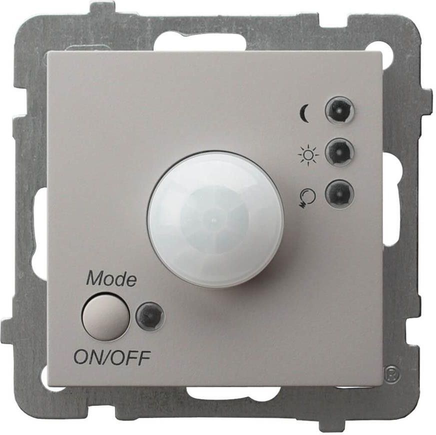 Elektroniczny czujnik ruchu służy do automatycznego załączania źródeł światła oraz sprzętu sygnalizacyjnego (np. w domowych systemach alarmowych) po wykryciu ruchu w strefie zasięgu i samoczynnego wyłączania po upływie nastawionego czasu. Do kompletu wymagana ramka. Można stosować do systemów ramkowych wielokrotnych. Czujnik ruchu współpracuje z żarówkami typu LED. Konstrukcja czujnika umożliwia jego zastosowanie do budowania szeregowych instalacji złożonych z dowolnej liczby czujników, jak również z innymi standardowymi łącznikami do użytku domowego (np. jednobiegunowy lub zmienny). Sterowanie czujnikiem odbywa się poprzez naciskanie przycisku znajdującego się w lewym dolnym rogu pokrywy zewnętrznej oznaczonego MODE/ON/OFF. Istnieje możliwość ustawienia jednego z pięciu trybów pracy: OFF - tryb wyłączony (czujnik całkowicie wyłączony). Dioda przekaźnika (przy piktogramie żarówki) świeci na zielono. ON - tryb włączony (czujnik włącza oświetlenie na stałe - pełni funkcję łącznika jednobiegunowego) dioda przekaźnika (przy piktogramie żarówki) świeci na czerwono. RUCH - DZIEŃ - tryb, w którym włączenie oświetlenia następuje w chwili kiedy czujnik wykryje ruch niezależnie od stopnia natężenia światła w pomieszczeniu w którym zainstalowany jest czujnik (dzień lub noc). Dioda trybu "ruch" (przy piktogramie słoneczka) zapala się na kolor czerwony. Dioda "przekaźnika" (przy piktogramie żarówki) pali się na zielono jeżeli oświetlenie jest wyłączone lub na czerwono jeżeli oświetlenie jest załączone. RUCH - NOC - tryb, w którym włączanie oświetlenia następuje w chwili wykrycia ruchu przez czujnik, ale tylko w przypadku gdy natężenie światła w pomieszczeniu w którym zainstalowany jest czujnik spada poniżej określonego poziomu. Poziom ten definiuje użytkownik poprzez przekręcanie pokrętła regulacyjnego (opisanego jako LUX ) znajdującego się na module sterownia pod pokrywą zewnętrzną czujnika z lewej strony. Zakres regulacji mieści się w granicach od 0 do 1000 lux. Podczas tego trybu dioda "ruch - noc" (przy piktogramie księżyca) pali się na czerwono, natomiast dioda przekaźnika (przy piktogramie żarówki) pali się na zielono jeżeli oświetlenie jest wyłączone lub na czerwono jeżeli oświetlenie jest załączone. RANDOM - tryb symulacji obecności - jest formą zabezpieczenia pomieszczenia przed włamaniem podczas długotrwałej nieobecności użytkownika. Po zapadnięciu zmierzchu czujnik w losowo wybranym czasie w zakresie od 10 do 60 min włączy oświetlenie na ustawiony przez użytkownika czas, pomnożony przez losowy mnożnik z zakresu 1÷3. Regulacji nastawy czasu dokonuje się za pomocą pokrętła (opisanego jako TIME) umieszczonego na module sterowania pod pokrywą zewnętrzną z prawej strony. Zakres regulacji mieści się w granicach 3s÷5min. Podczas tego trybu 2 diody (przy piktogramach słoneczka i księżyca) migają na przemian kolorem czerwonym. Funkcja blokady przycisku sterowania W przypadku zainstalowania wyrobu w obiekcie publicznym (np. hotel), administrator budynku często nie życzy sobie aby przypadkowe osoby dysponowały możliwością zmiany nastawy trybu pracy czujnika ruchu. Należy wówczas skorzystać z funkcji blokady przycisku sterowania. Inicjujemy ją naciskając i przytrzymując powyższy przycisk przez ok. 10s. W trakcie tej nastawy czujnik nie będzie reagował na krótkotrwałe naciskanie przycisku. Odwołanie funkcji blokady realizujemy również poprzez naciśnięcie i przytrzymanie przycisku przez ok. 10s.
