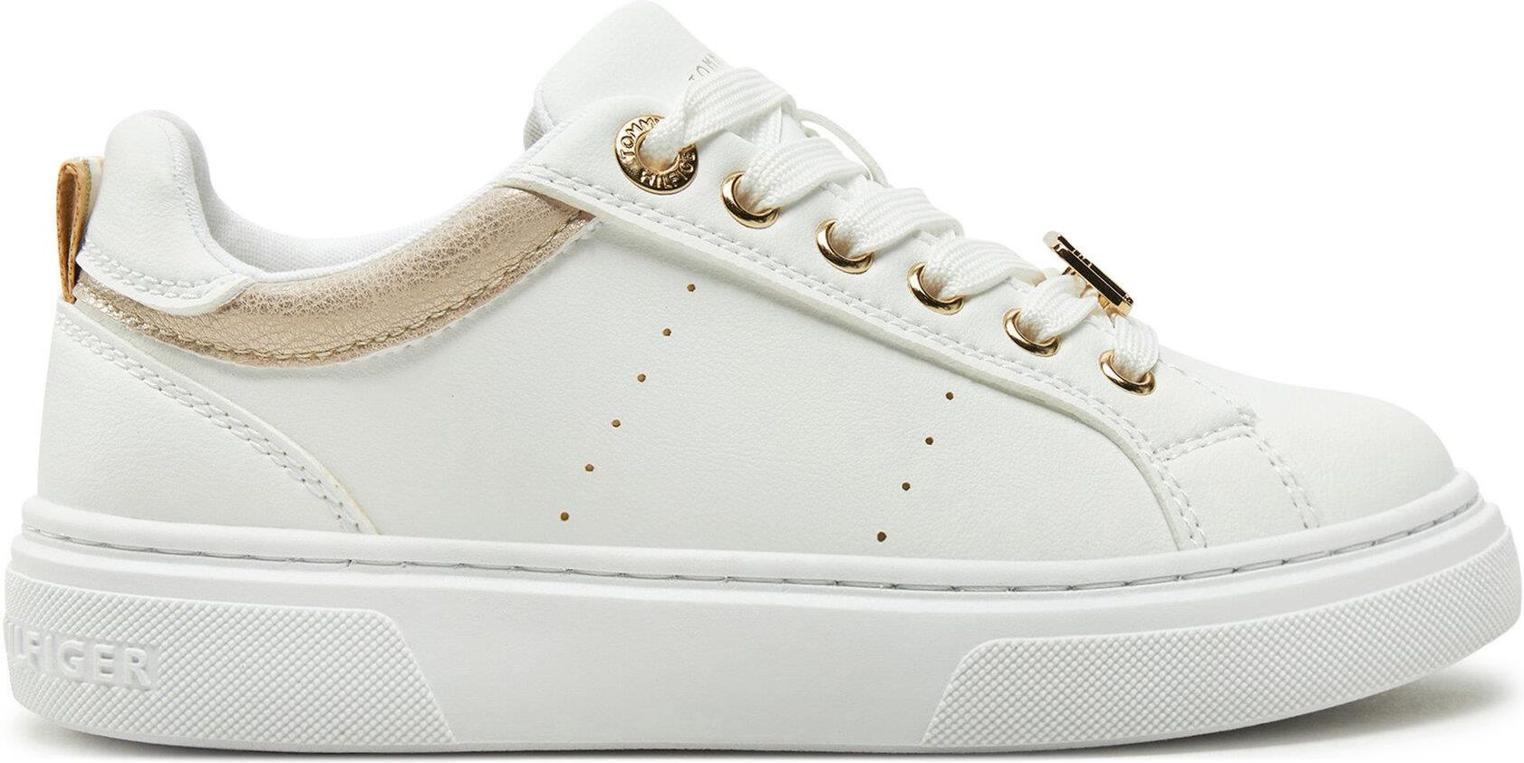 Zachwyć się wyjątkowym stylem i komfortem – te eleganckie, dziewczęce sneakersy Tommy Hilfiger podbiją serca małych elegantek. Biały, modułowy fason z imitacji skóry świetnie komponuje się z każdym strojem, a wysokogatunkowe tworzywo podeszwy zapewnia niezawodną trwałość. Ozdobne detale w złotym kolorze nadają całości szlachetnego charakteru, podkreślając oryginalność butów. Wkładka z materiału gwarantuje wygodę na każdym kroku!