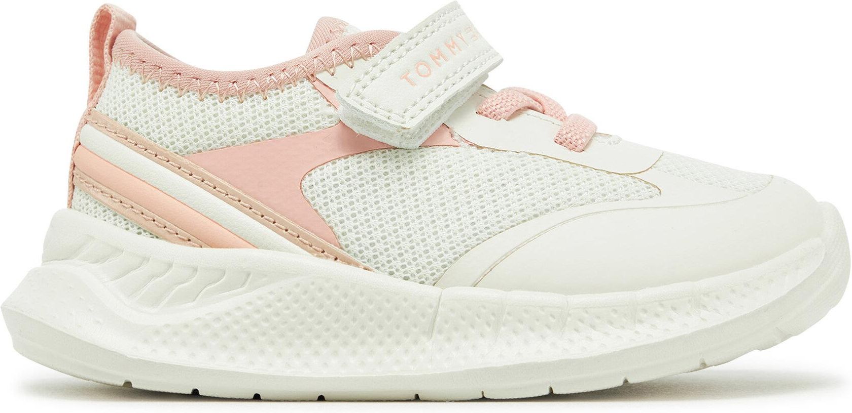 Modne i wygodne sneakersy dla dziewczynek od Tommy Hilfiger to idealny wybór na co dzień! Wykonane z połączenia materiału tekstylnego i wysokogatunkowego tworzywa syntetycznego, gwarantują trwałość i komfort noszenia. Okrągły nosek zapewnia wygodę małym stopom, a zapięcie na rzep umożliwia szybkie i łatwe zakładanie. Dodatkowo gumowy klin w cholewce zwiększa elastyczność obuwia, oferując swobodę ruchów. To doskonały model dla aktywnych małych fashionistek, które cenią sobie wygodę połączoną z nowoczesnym stylem.