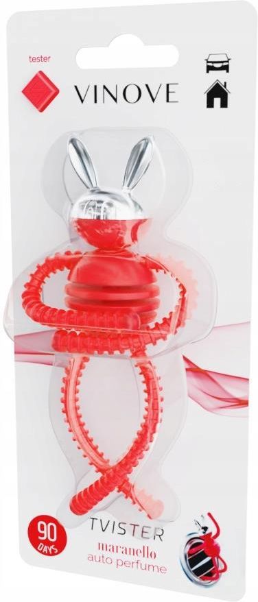 VINOVE - EKSKLUZYWNE PERFUMY SAMOCHODOWE Nowa marka perfum samochodowych, stworzona przez polskich pasjonatów we współpracy z francuskimi mistrzami sztuki perfumeryjnej i włoskimi projektantami oraz naukowcami. Do ich stworzenia zastosowano technologię XXI wieku. Wykorzystując wiedzę, otwartość i doświadczenie zespołu naukowców i wspólnie z nimi udało się skondensować zapachy w nowatorskim polimerze. Nadano mu taki kształt, by powietrze z wywietrzników samochodowych delikatnie opływało polimerowy labirynt, uwalniając zapach subtelnie i długotrwale – aż do 90 dni. Projektując nośnik zapachu brano pod uwagę przede wszystkim jego walory użytkowe: długotrwałość uwalniania zapachu, bezpieczeństwo dla tapicerki i kokpitu samochodu, a także ekskluzywny wygląd, współgrający ze stylistyką nowoczesnych aut. Rodzaj - WOMEN’s fragrances Kolekcja - TVISTER Zapach - MARANELLO Trwałość - 90 dni Tvister to technologiczna nowość – połączenie zapachu i designerskiego ludzika, to pierwszy produkt na rynku, który przybiera taki kształt, jaki Klient sobie wymyśli. Ty decydujesz jak Twój Tvister ma wyglądać w kratce wentylacyjnej, szafie czy na biurku Kreatywny produkt – wymyśl pozycję i ciesz się zapachem Tvister to wyrób pasujący do wszystkich kratek wentylacyjnych w samochodach Pachnie do 90 dni dzięki specjalnie zaprojektowanej, maksymalnej powierzchni oddawania zapachu Maranello to zapach przepełniony energią, emocjami i tajemnicą. Przywodzi na myśl wspomnienia bezsennych nocy, szaleńczych wypraw, niekończących się podróży. Łączy w sobie dojrzałość wanilii, subtelność delikatnych kwiatów jaśminu oraz energię pomarańczy… Ten zapach jest kobietą. Nuta głowy: pieprz, mandarynka, gruszka Nuta serca: kwiat pomarańczy, jaśmin Nuta bazowa: kawa, wanilia Wymyślone we Francji. Zaprojektowane we Włoszech. Wyprodukowane w Polsce (według niemieckich norm jakościowych).