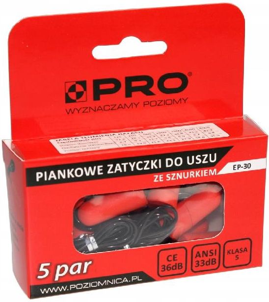 Jednorazowe zatyczki do uszu wykonane z wolno rozprężającej się miękkiej pianki poliuretanowej Charakteryzują się dobrą ochroną słuchu prze nadmiernym hałasem na stanowisku pracy łatwość zakładaniu i duży komfort uzytkowania Skuteczność tłumienia hałasu Opakowanie może służyć za pojemnik Każda para słuchawek jest połączona sznurkiem Spełniają wymagania normy EN352-2:2002 Opakowanie zawiera 5 par zatyczek do uszu