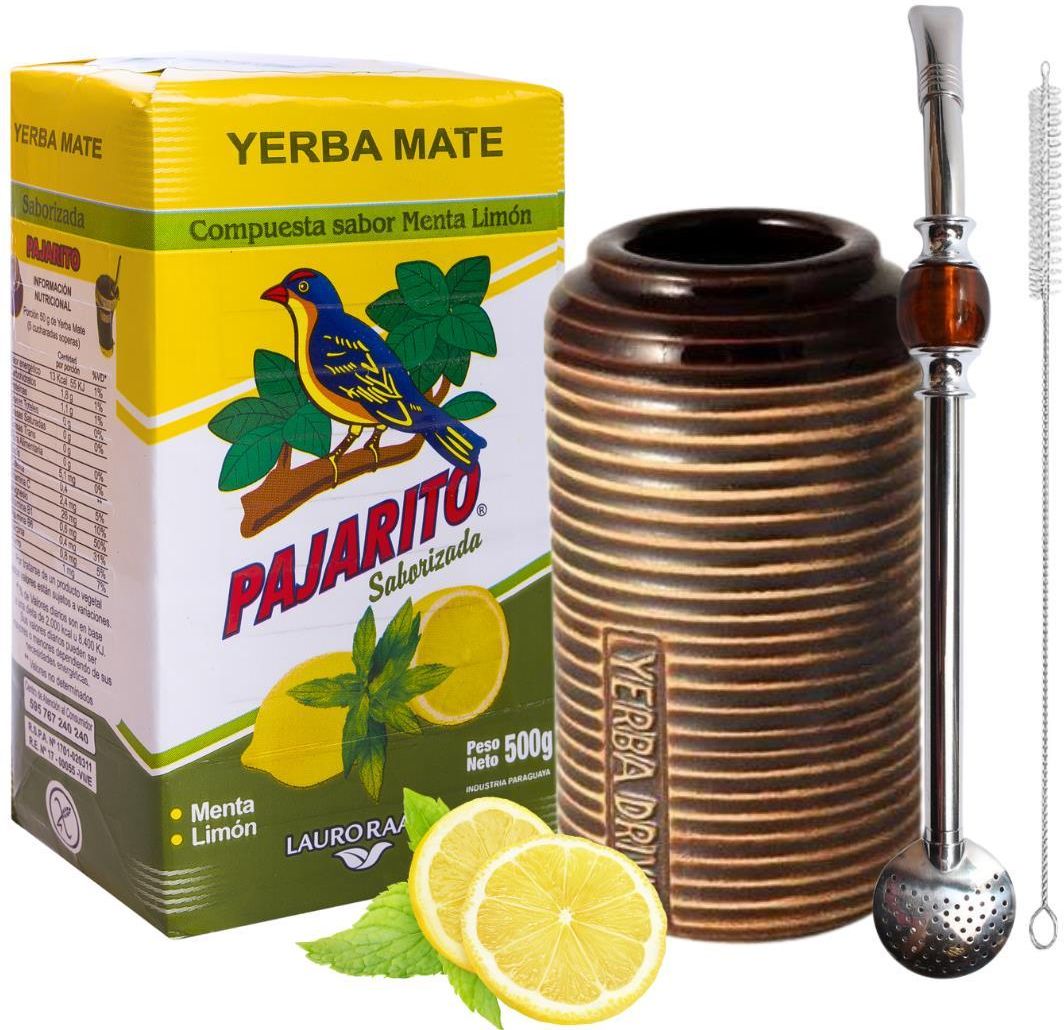 Zestaw Startowy Yerba Mate Pajarito Limon Tykwa Bombilla Już teraz, masz szanse na wyposażenie się we wszystkie niezbędne przedmioty do picia yerba mate czyli najlepszego zioła na świecie! Idealny zestaw yerba mate zawiera Yerba Mate Pajarito Menta Limon 0,5kg Matero Porongo Roches 360ml Bombilla z bursztynowym kamieniem 21cm + Czyścik Zestaw idealnie nada się jako prezent! Yerba Mate Pajarito Compuesta sabor Menta Limon Skład: yerba mate, aromaty: mięta, cytryna. Masa netto: 500g. Wyprodukowano i zapakowano w Paragwaju. Producent: Lauro Raatz S.A. Miętowo-cytrynowa wersja tradycyjnej paragwajskiej yerba mate. Gorzka, dymna, mocno cytrynowa i ziołowa. Dla wielbicieli miętowych i owocowych smaków i aromatów. Świetnie nadaje się do przyrządzenia terere. Pajarito to znana i ceniona paragwajska marek wytwarzana na plantacjach Lauro Raatz w południowo-wschodnich rejonach Paragwaju już ponad 60 lat. Znana z wysokiej jakości i intensywnego smaku. Jedyna w swoim rodzaju! Matero ceramiczne Roches - 360 ml Ta ceramiczna tykwa do yerba mate w kolorze ciemnego marmuru to stylowy design i najwyższe walory użytkowe. Idealnie leży w dłoni i nie wymagające jeśli chodzi o konserwację. Jego pojemność to 360 ml, dzięki czemu pomieści solidną porcję naparu. Można myć je w zmywarce! Bombilla do Yerba Mate z kamieniem Bursztynowy + Czyścik Bombilla to specjalna rurka lub słomka używana do picia yerba mate, tradycyjnego napoju popularnego w Ameryce Południowej, zwłaszcza w krajach takich jak Argentyna, Paragwaj, Urugwaj i Chile. Bombilla jest nieodłącznym elementem kultury picia yerba mate. Duża bombilla do yerba mate, przy ustniku znajduje się kolorowy kamień chłodzący. Stal nierdzewna zapewnia trwałość i odporność na uszkodzenia mechaniczne i wysokie temperatury. Prosty design nadaje elegancji i funkcjonalności. długość: 21cm Zestaw Startowy do Yerba Mate Pajarito Limon Tykwa Bombilla